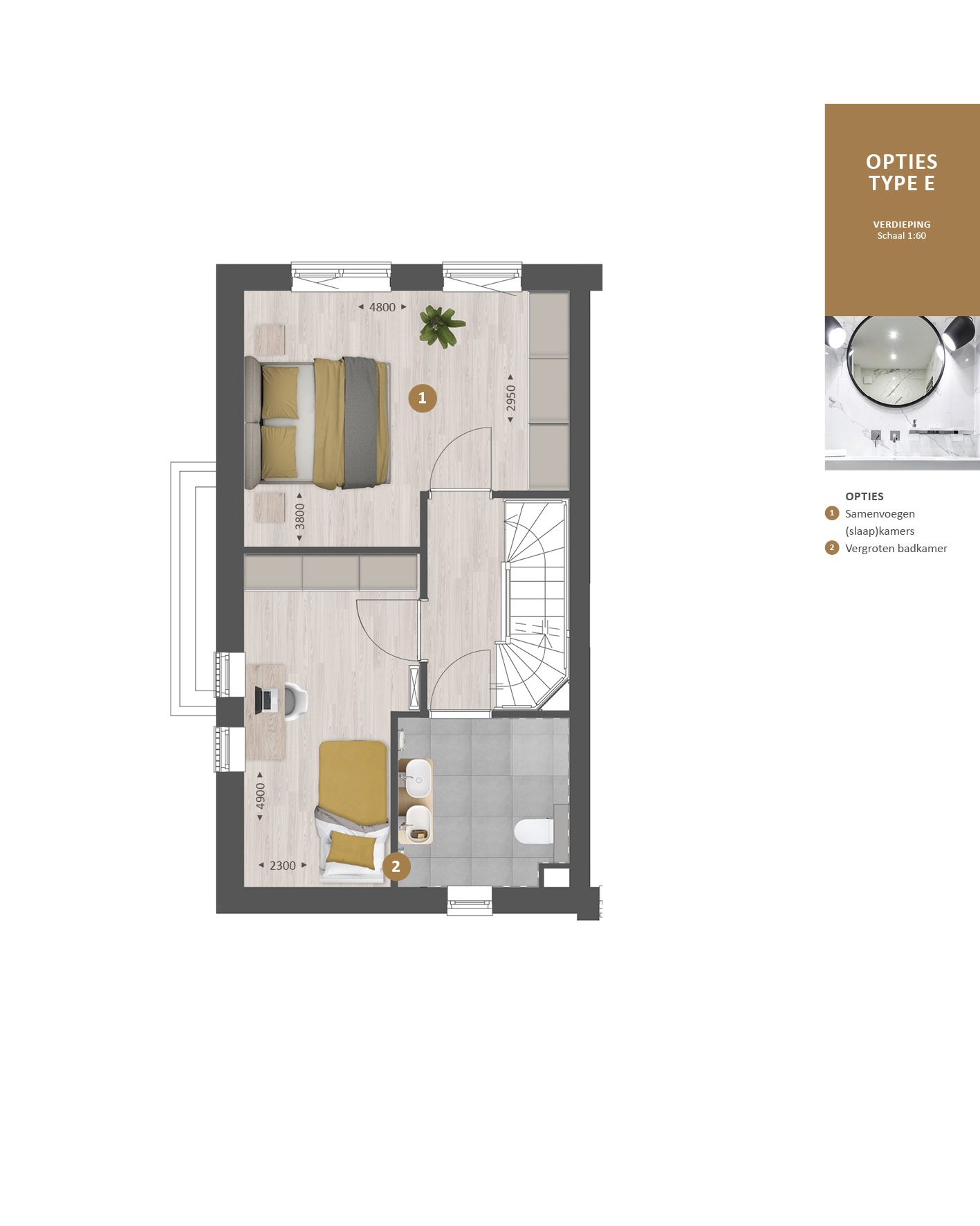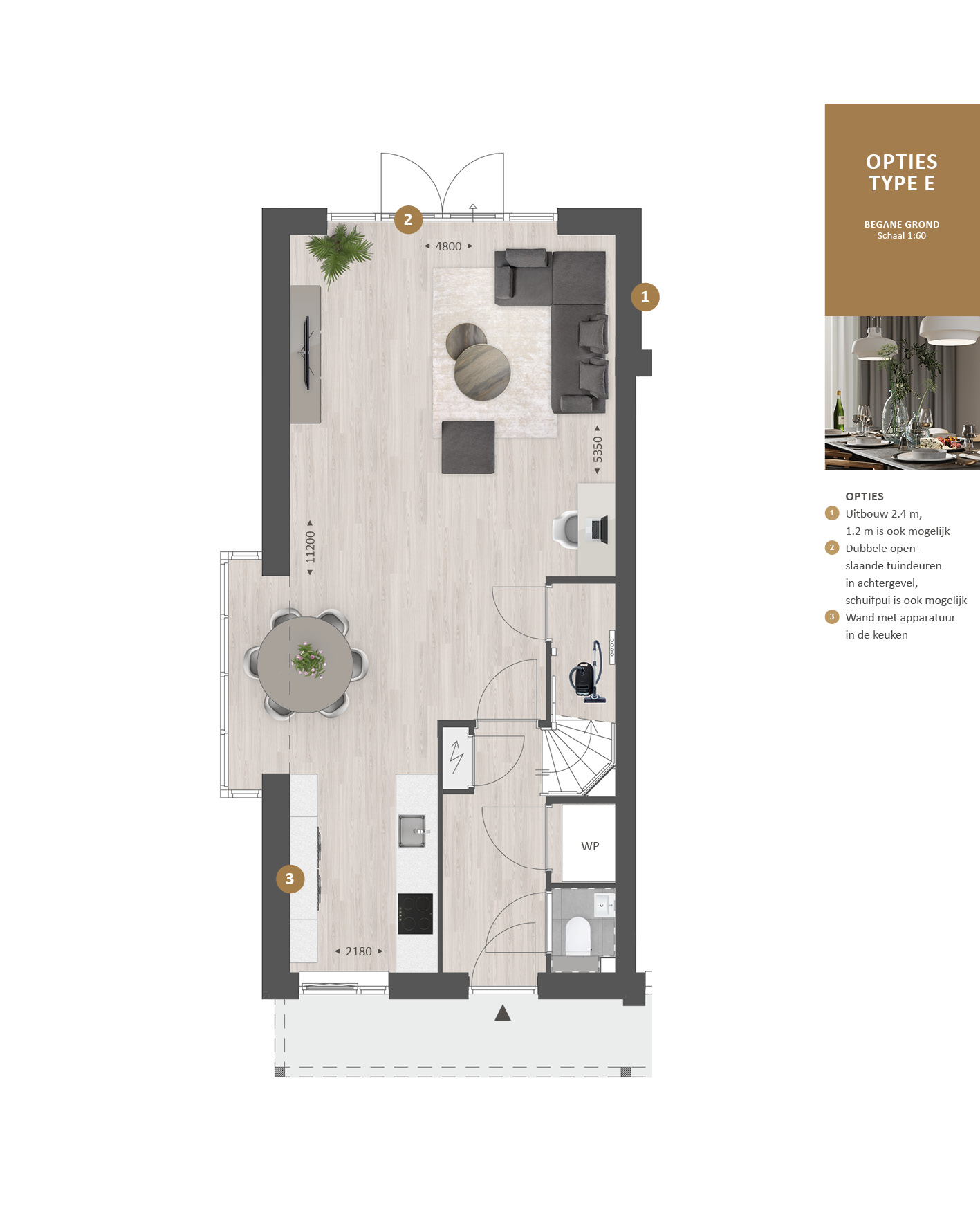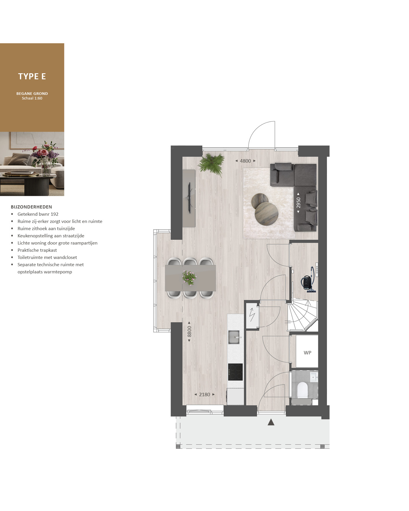 De indeling is bijzonder praktisch met beneden een hal met toilet en technische ruimte, een lichte tuingerichte woonkamer en een open keuken met zicht op de straat. TIP: Maak de woonkamer nóg groter met de optie om deze met 1.20m of 2.40m uit te breiden. De optie voor openslaande tuindeuren zorgen voor veel contact met de achtertuin.Ā Ā