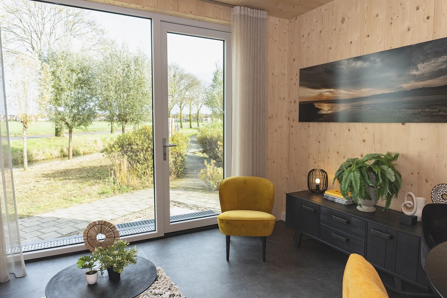 De wanden zijn standaard van hout en behoeft geen verdere afwerking. In de badkamer zijn de wanden voorzien van kunststof panelen/tegels.