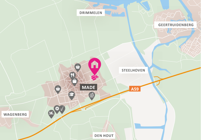 Made is een levendig dorp in de gemeente Drimmelen, vlak boven Breda. Met zo’n 12.000 inwoners profiteer je er van de voorzieningen van een stad, omringd door Brabantse gemoedelijkheid. En dankzij de ligging aan de A59 sta je zó in hartje Breda, of middenin de natuur van De Biesbosch. In Made woon je precies goed. Centraal in Brabant met groene natuur, dagelijkse voorzieningen en gezellige plekken binnen handbereik. Je fietst makkelijk het buitengebied in, of naar een terras in bruisend Breda. En via de A59 en A27 rij je binnen de kortste keren naar steden als Dordrecht, Rotterdam of Antwerpen.