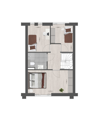 Op de verdieping vind je drie slaapkamers (waarvan 1 over de volledige breedte van het huis) en een complete badkamer met douche, wastafel en 2e toilet. Wil je een ligbad? Dat kan! Creëer meer ruimte in de badkamer door te kiezen voor een apart toilet op deze verdieping. Je kunt bijvoorbeeld ook de 2 slaapkamers aan de achterzijde samenvoegen tot één grote hoofdslaapkamer.
