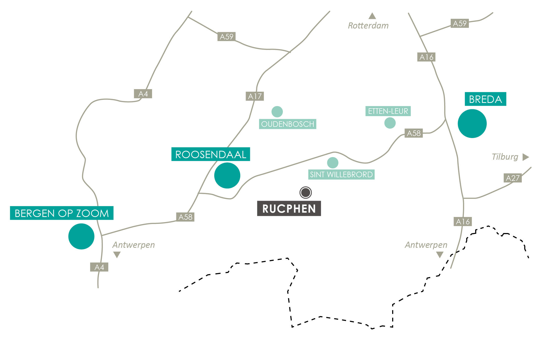 Aan de zuidwestzijde van Rucphen wordt het nieuwbouwplan Hofstede gerealiseerd. Het plangebied grenst aan het groene landelijke gebied tussen Rucphen en Roosendaal, waar onder andere de Rucphense Bossen te vinden zijn. Dat maakt het uitermate geschikt voor een rustige wandeling of een lekker uitgebreide fietstocht. Mocht je de drukte van de stad willen opzoeken dan kan dat ook. De steden Breda, Dordrecht of Roosendaal zijn goed bereikbaar. Met de auto ben je binnen een uur in Rotterdam of Antwerpen.