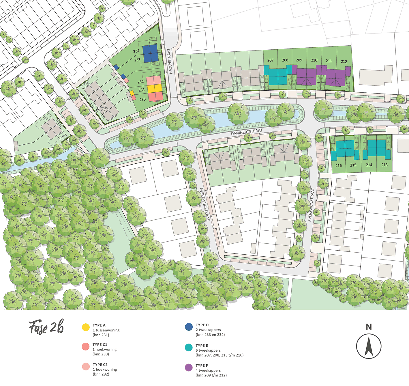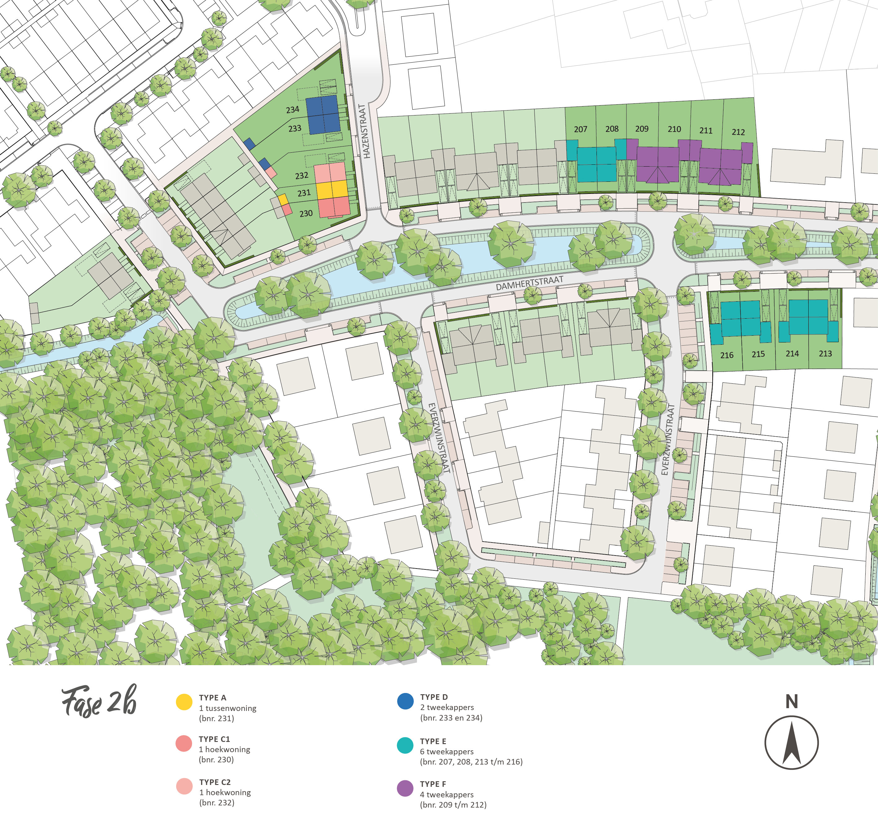 Het woningaanbod in fase 2B bestaat uit 12 ruime en energiezuinige (energielabel A+++) tweekappers op ruime kavels. Maar ook uit 3 hoekwoning en een tussenwoning. Deels gelegen aan een prachtige brede groenzone met speelse wadi. Het woningaanbod is ideaal voor gezinnen die op zoek zijn naar een plek om te wonen en te ontspannen.
