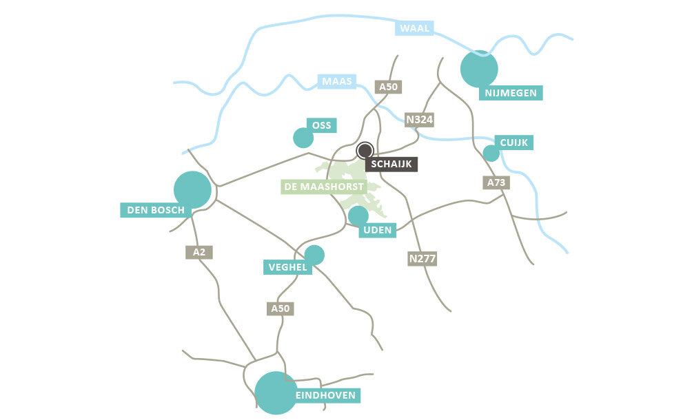 Schaijk is een levendig dorp met zo’n 7.000 inwoners in de Brabantse gemeente Maashorst. Je woont er omringd door de natuur én dichtbij grotere plaatsen als Oss, Uden, Nijmegen en Den Bosch.