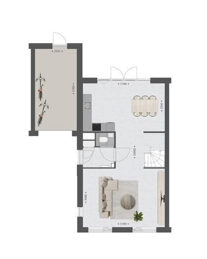 De indeling is bijzonder praktisch met beneden een hal met toilet en garderobe. Het woongedeelte bevindt zich aan de voorzijde, het eetgedeelte met keuken aan de achterzijde. De vertrekken worden van elkaar gescheiden door de hal en de trapopgang. De begane grond kan vergroot worden met 1.20 of 2.40 meter waarbij de keuken naar de voorzijde verplaatst kan worden. Met de optie om de garage te verlengen en/of te splitsen in een berging en een ruimte bij de woning te betrekken, creëer je extra veel leefruimte op de begane grond.
