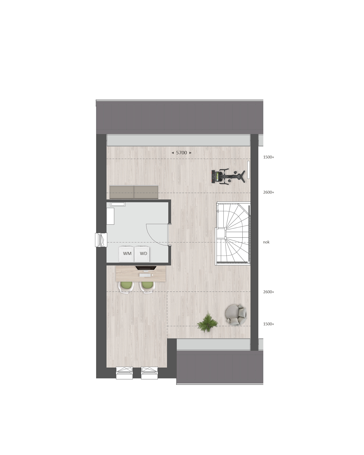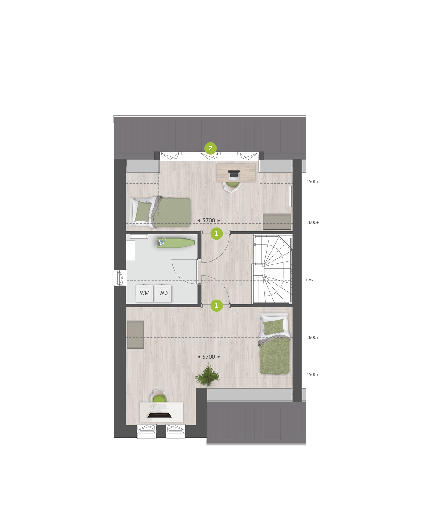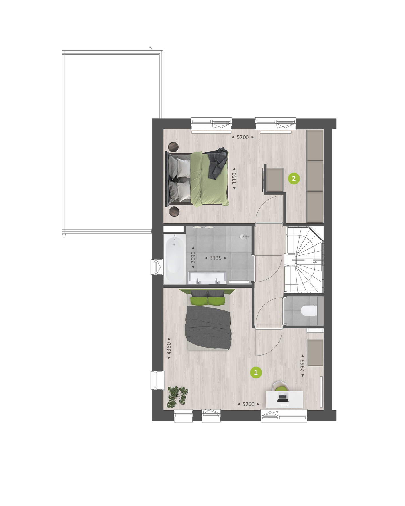 De tweede verdieping is ruim van opzet. Met de combinatie van diverse indelingsopties maak je hier een prachtige woonverdieping met bijvoorbeeld twee ruime kamers met dakkapel aan de voor- en/of achterzijde.