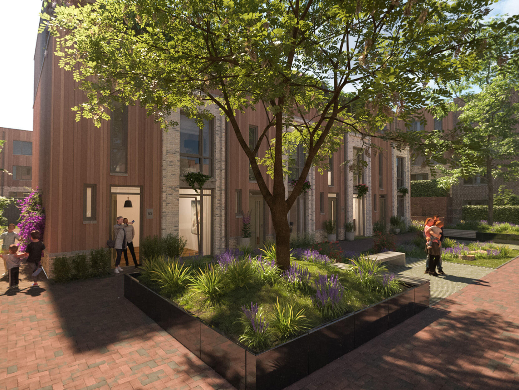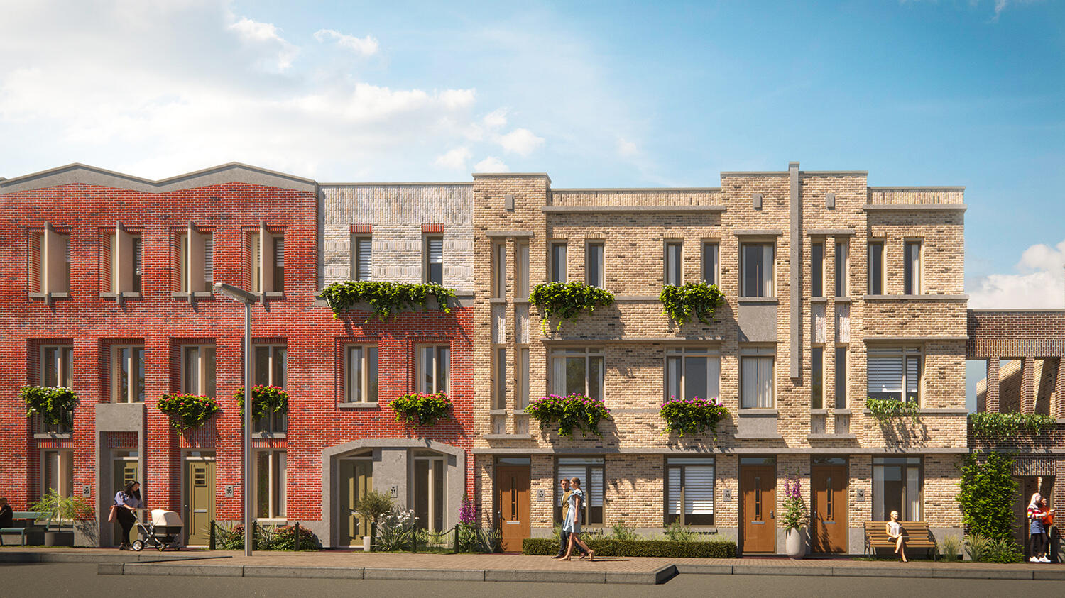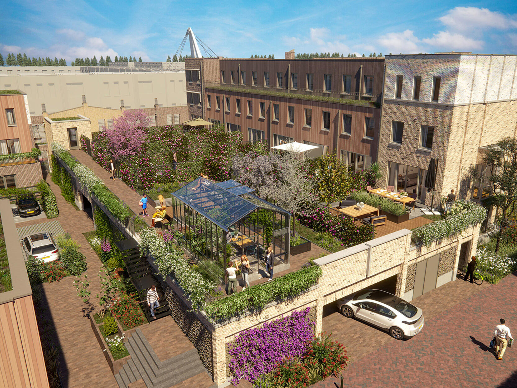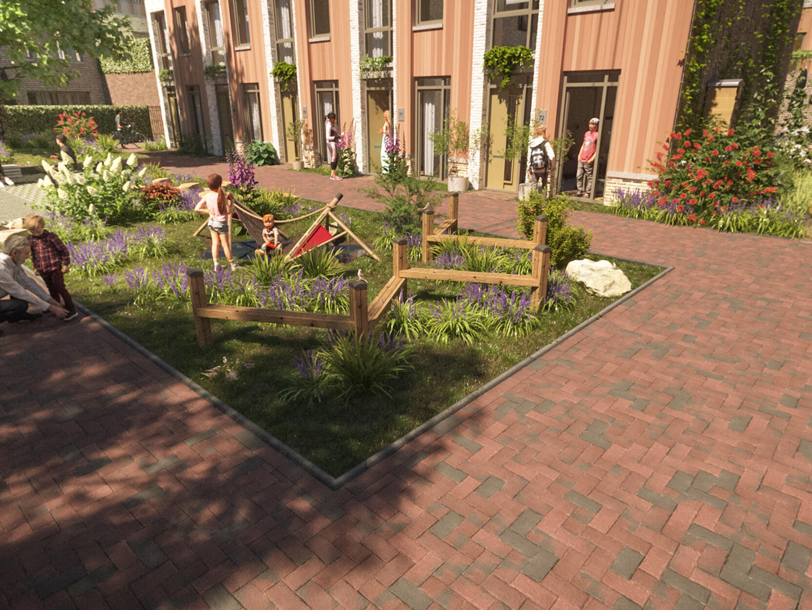 In 'De Groene Steegjes' in Utrecht Leidsche Rijn ontmoeten de groene charmes van het Willem-Alexanderpark en het weidse uitzicht over het Amsterdam-Rijnkanaal elkaar in een informeel hofje.