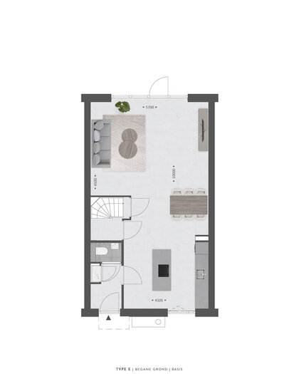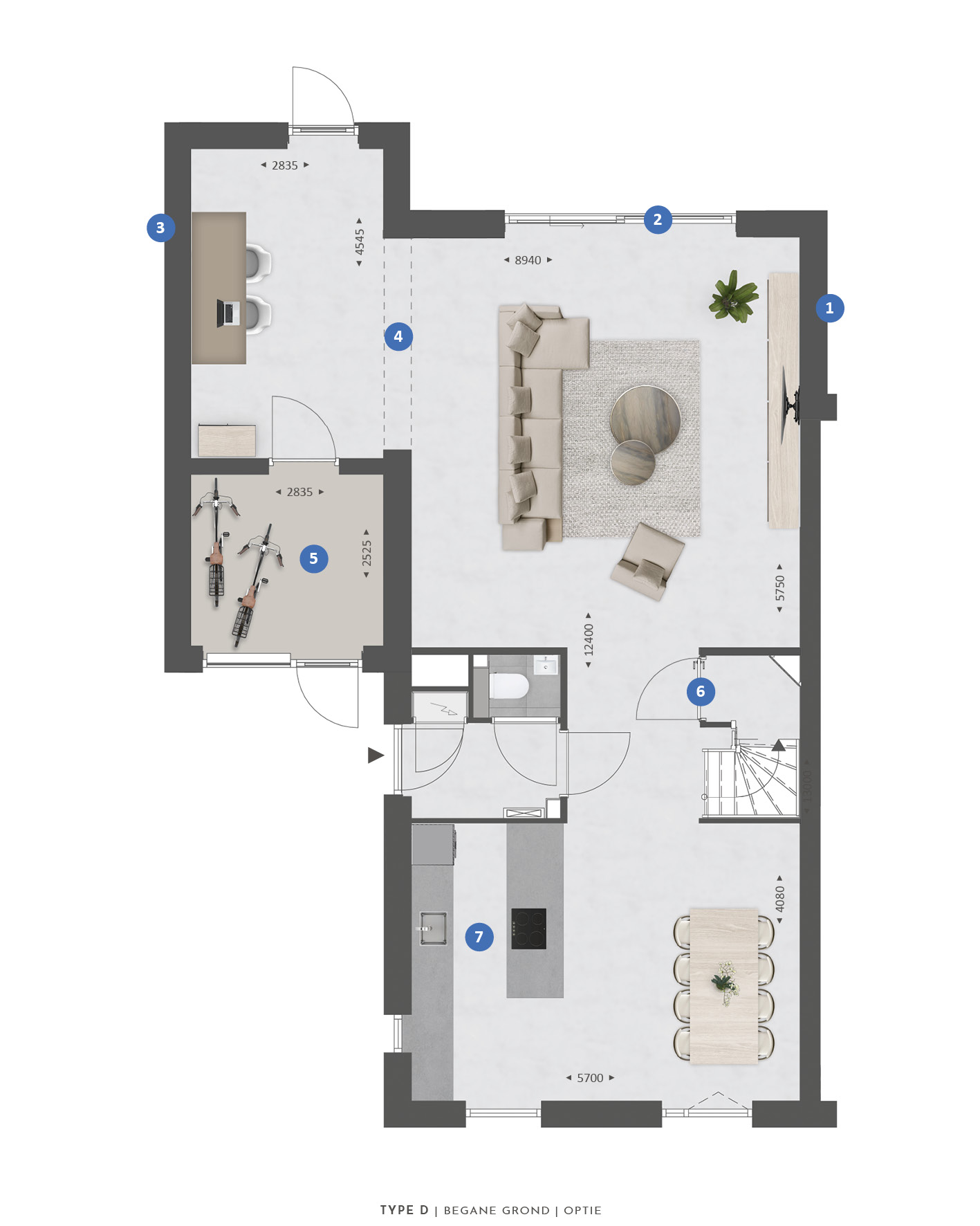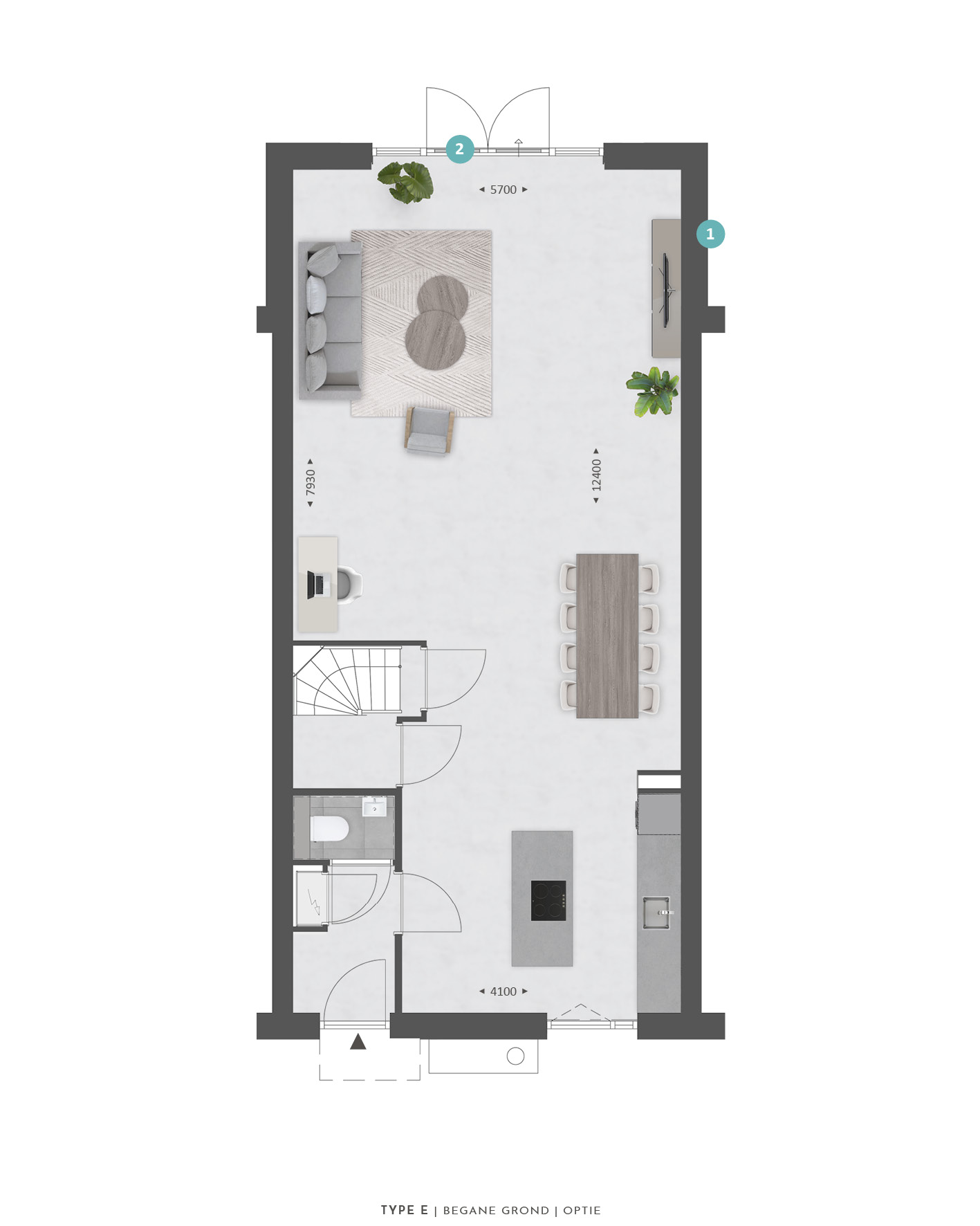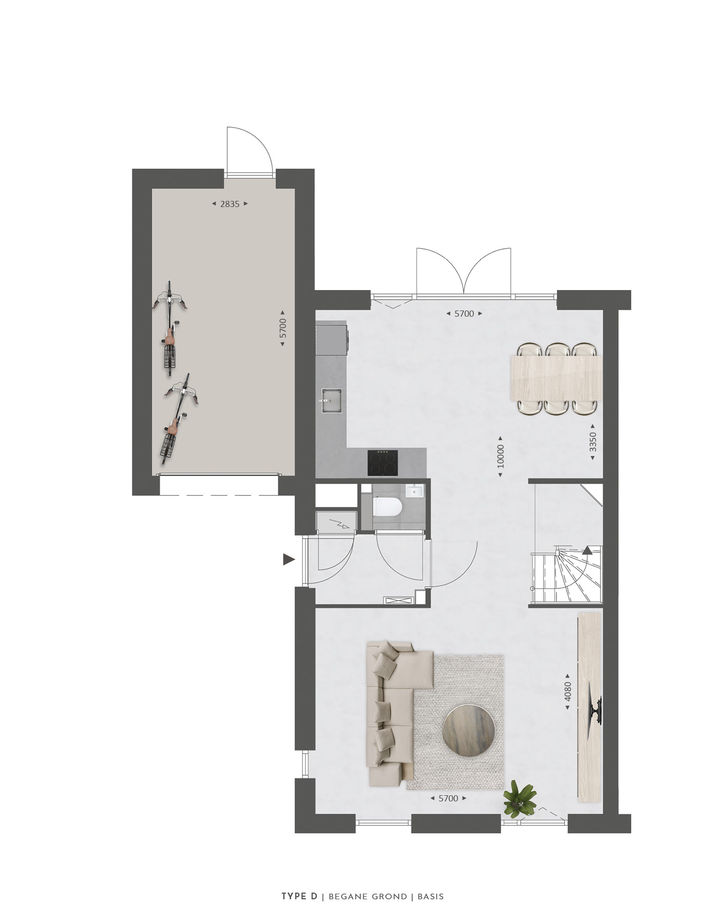 De indeling is bijzonder praktisch met beneden een hal met toilet en garderobe. Het woongedeelte bevindt zich aan de voorzijde, het eetgedeelte met keuken aan de achterzijde. De vertrekken worden van elkaar gescheiden door de hal en de trapopgang. De begane grond kan vergroot worden met 1.20 of 2.40 meter waarbij de keuken naar de voorzijde verplaatst kan worden. Met de optie om de garage te verlengen en/of te splitsen in een berging en een ruimte bij de woning te betrekken, creĆ«er je extra veel leefruimte op de begane grond.Ā