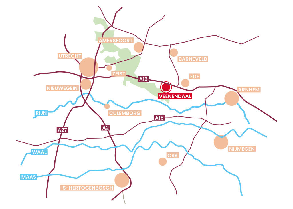 ’Veenendaal ligt centraal tussen grote steden als Utrecht, Nijmegen, Arnhem en Amersfoort. Vlakbij de rijkswegen A12, A15 en A30. Met drie stations in de gemeente is Veenendaal ook prima per trein ontsloten. Daarnaast zijn er vele directe bus-verbindingen naar de meeste gemeenten in de regio. Veenendaal ligt centraal in Nederland. Dat is niet alleen een pluspunt voor bewoners, maar ook voor de vele bedrijven die er zich vestigen. De combinatie van perfecte ligging en bereikbaarheid, goede voorzieningen, veel beschikbare woonruimte en een aantrekkelijk verblijfsklimaat zorgen voor een goed economisch perspectief. Voor studenten is er voldoende aanbod in omliggende steden om zich te ontwikkelen. Denk aan de CHE in Ede, Wageningen University of onderwijs in Arnhem, Nijmegen, Utrecht of Amersfoort.