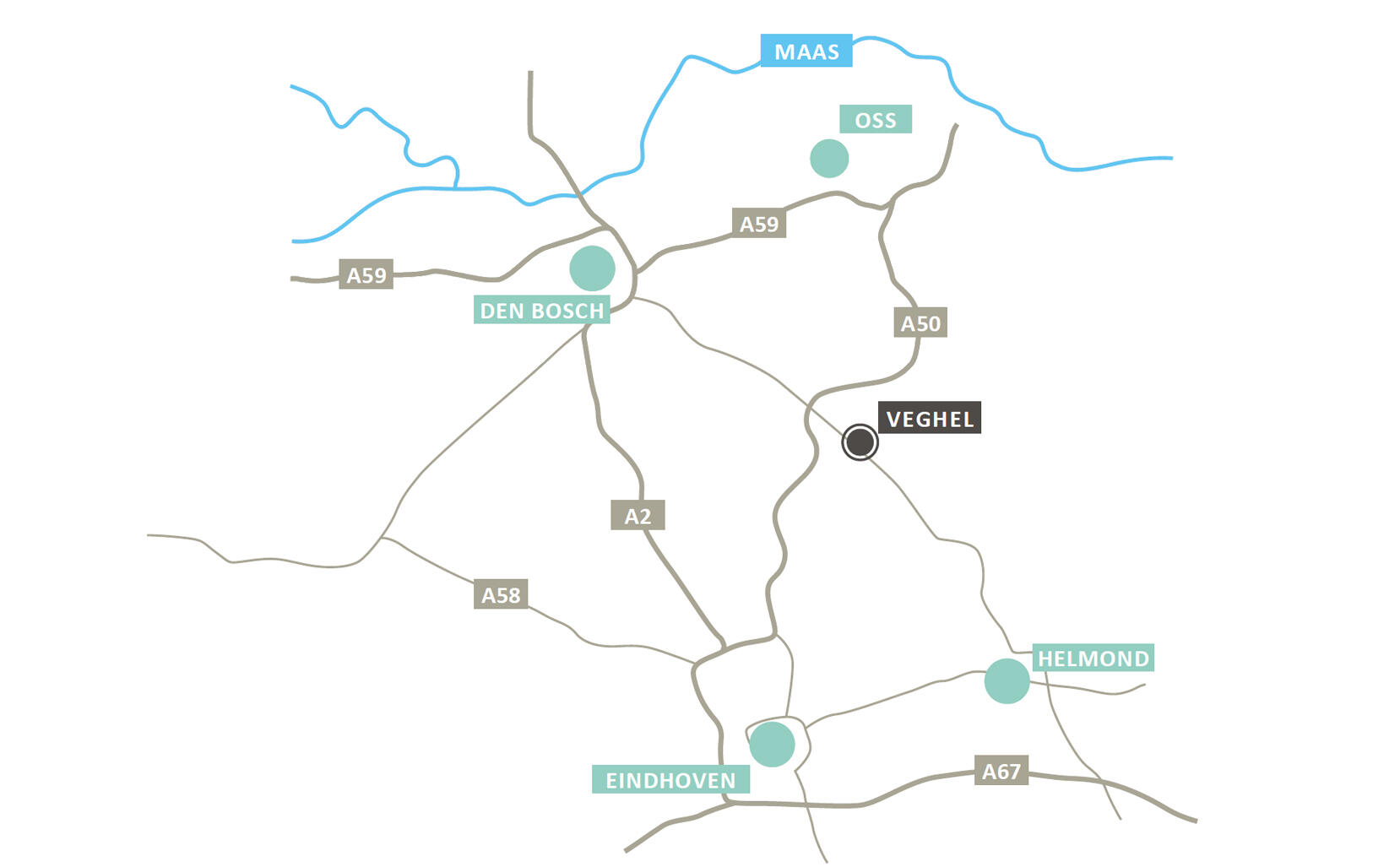 Veghel is gunstig gelegen aan de A50 op nog geen half uurtje rijden van Eindhoven, Den Bosch en Oss. Verder is er tussen Veghel, Eindhoven en Den Bosch hoogwaardig openbaar vervoer. Dit garandeert een snelle en directe verbinding met deze grote, aantrekkelijke winkel- en uitgaanssteden.