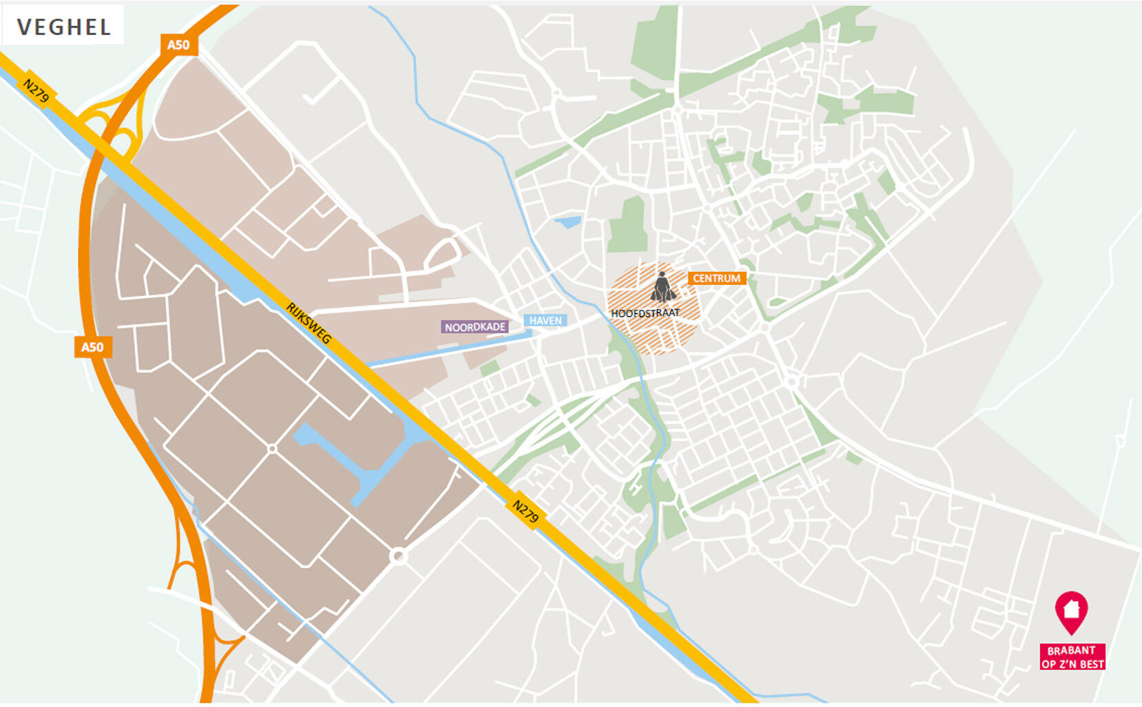 Veghel is gunstig gelegen aan de A50 op nog geen half uurtje rijden van Eindhoven, Den Bosch en Oss. Verder is er tussen Veghel, Eindhoven en Den Bosch hoogwaardig openbaar vervoer. Dit garandeert een snelle en directe verbinding met deze grote, aantrekkelijke winkel- en uitgaanssteden. Het centrum van Veghel is binnen slechts enkele fiets minuten bereikbaar.