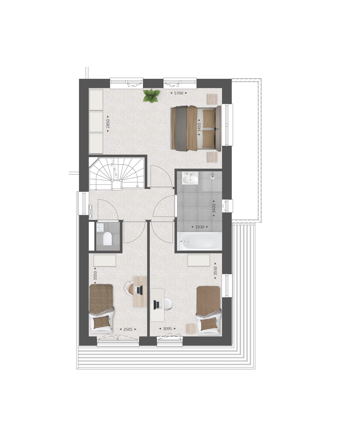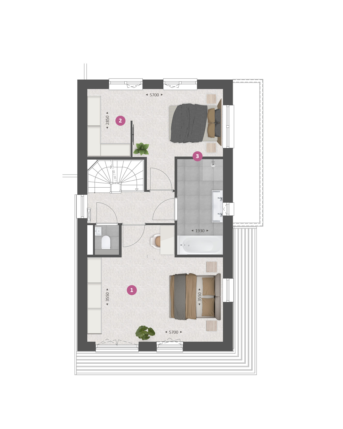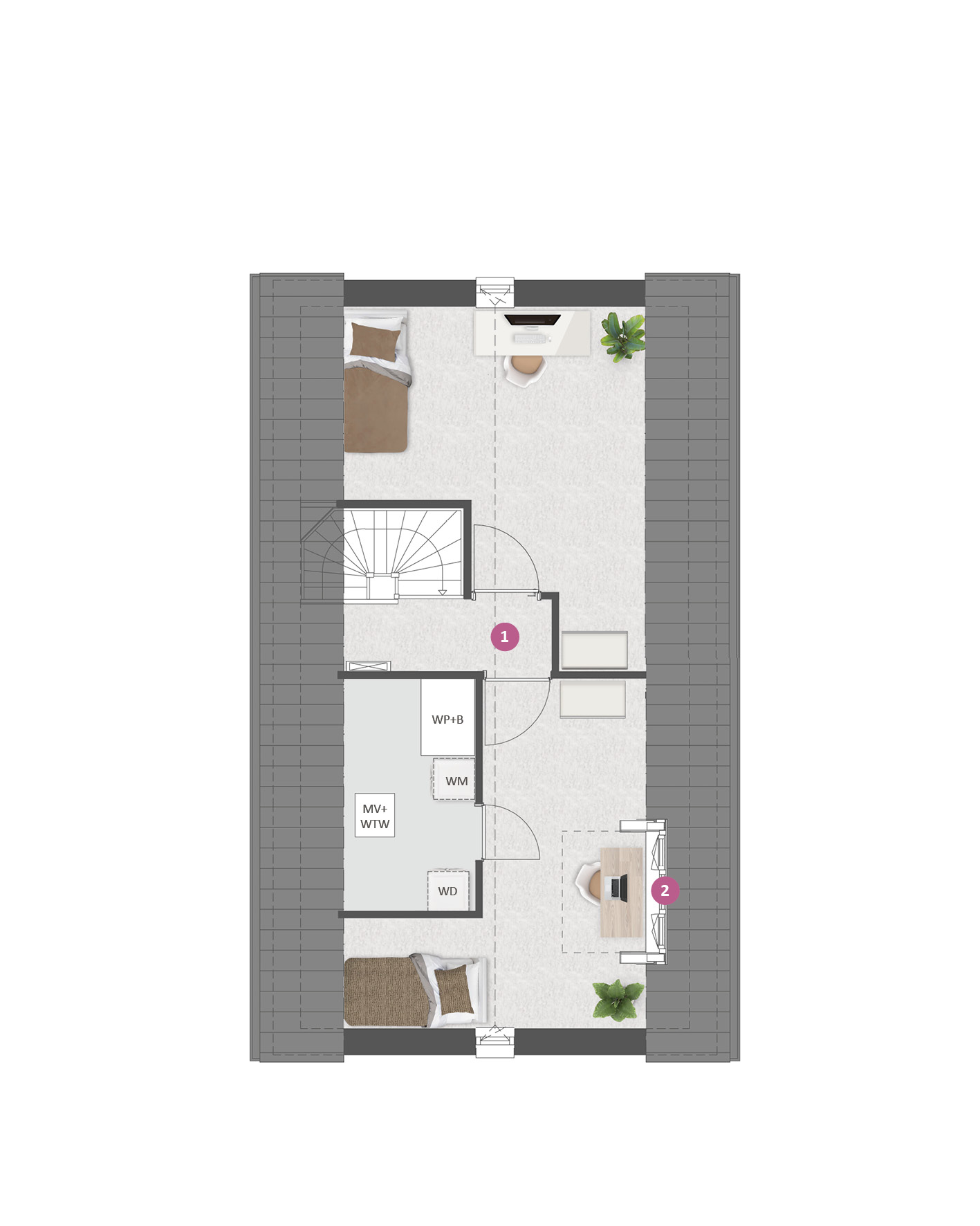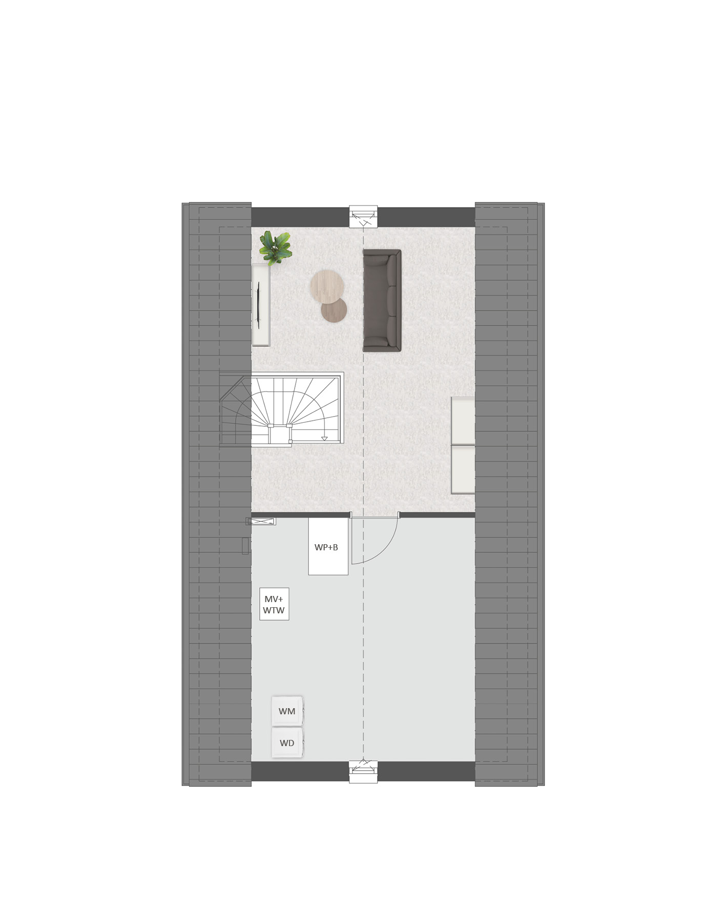 De tweede verdieping is ruim van opzet. Met een combinatie van diverse indelingsopties maak je hier een prachtige woonverdieping met bijvoorbeeld twee slaapkamers, een tweede badkamer en een was-/bergruimte.Ā