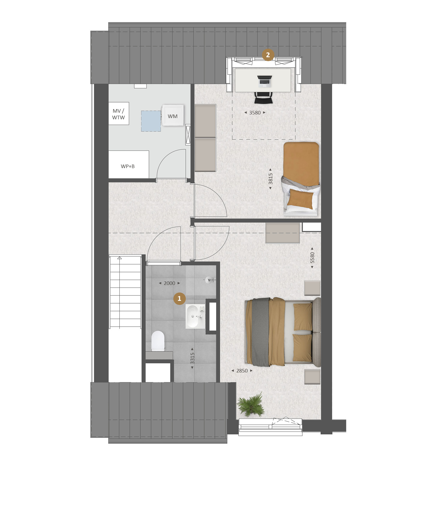 Op de verdieping vind je de overloop, twee ruime slaapkamers en een techniekruimte. Met de optie voor een dakkapel aan de voor- en/of achterzijde, creĆ«er je veel extra ruimte en lichtinval in de slaapkamers.Ā
