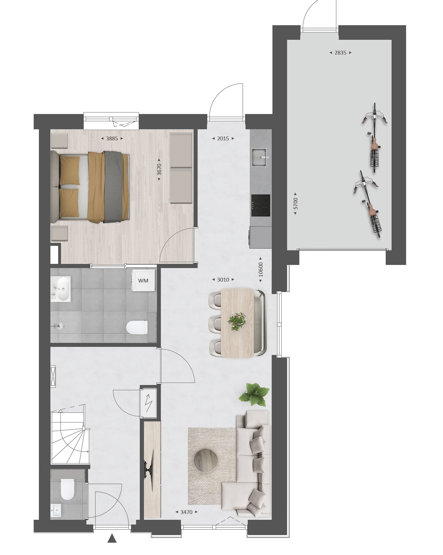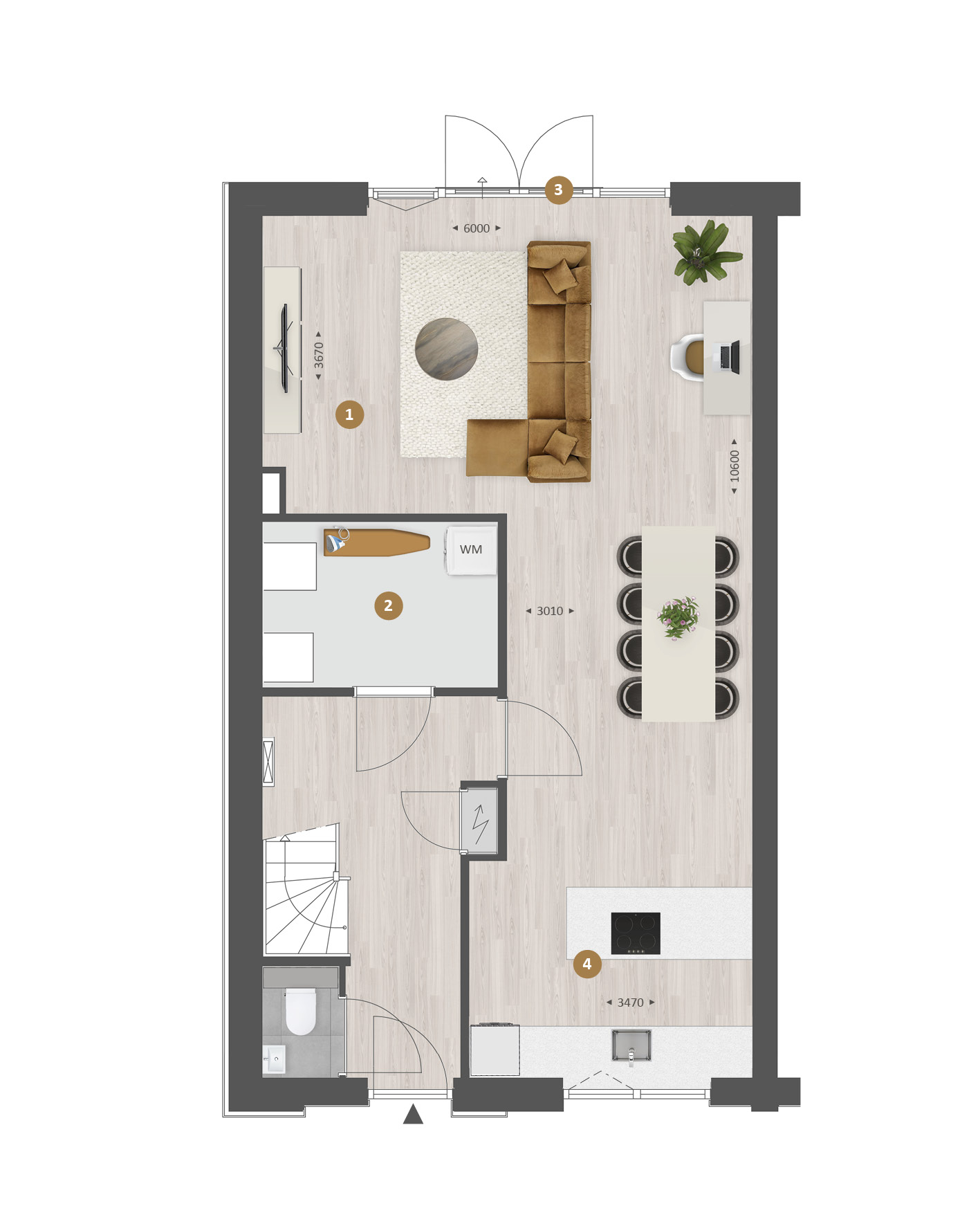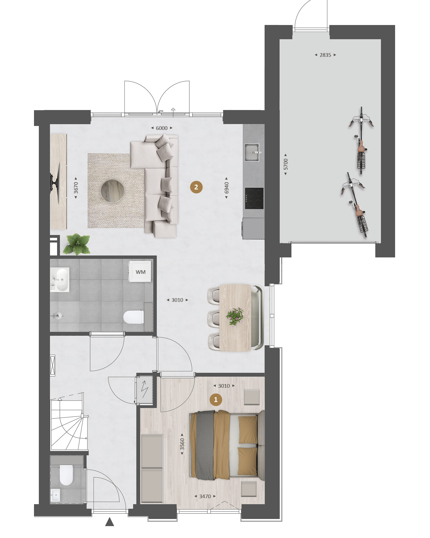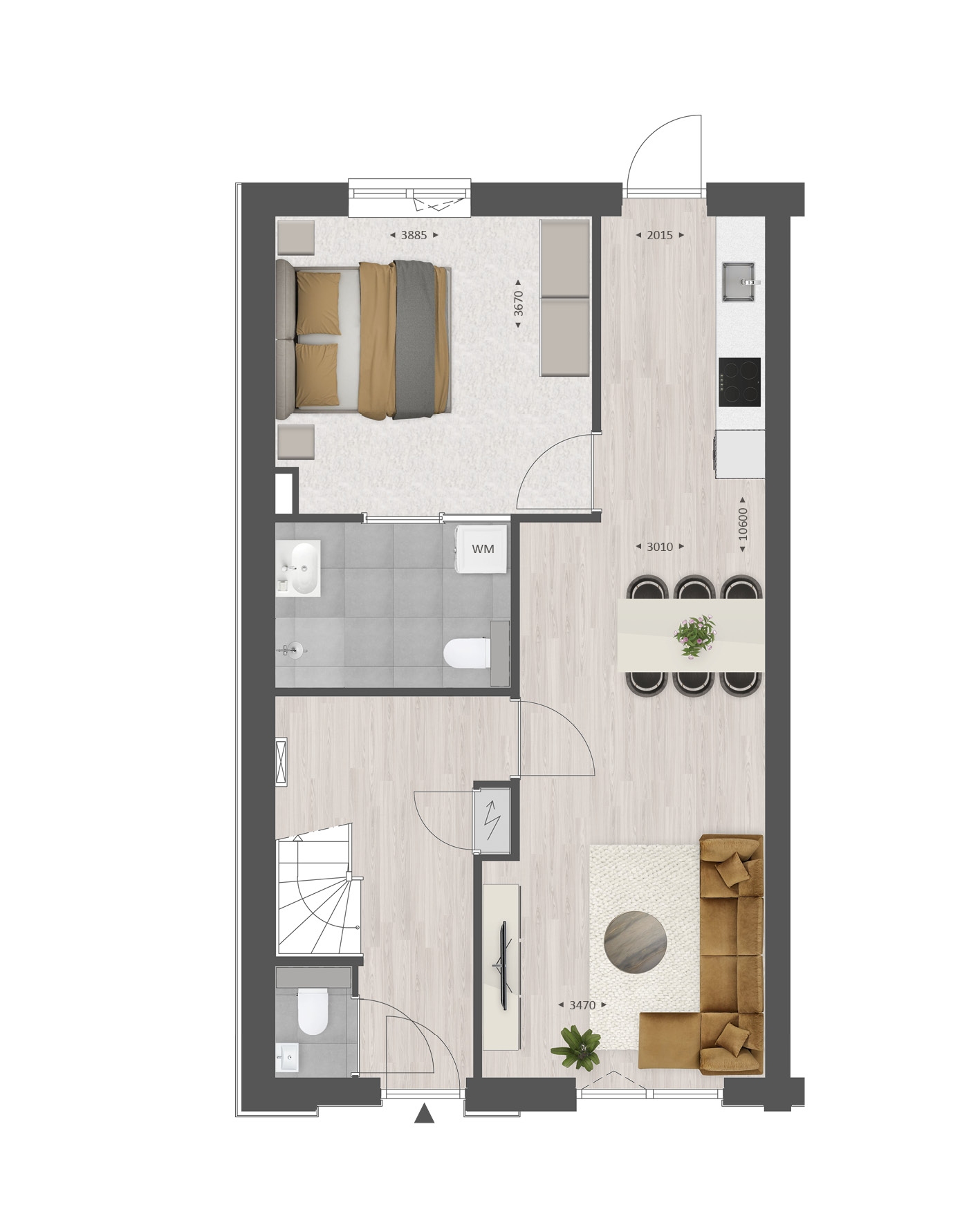 Wil je nóg meer leefruimte, dan kun je de slaapkamer bij de woonkamer voegen, kun je kiezen voor een praktische wasruimte op begane grond en een compacte doucheruimte op de verdieping met twee slaapkamers.Ā