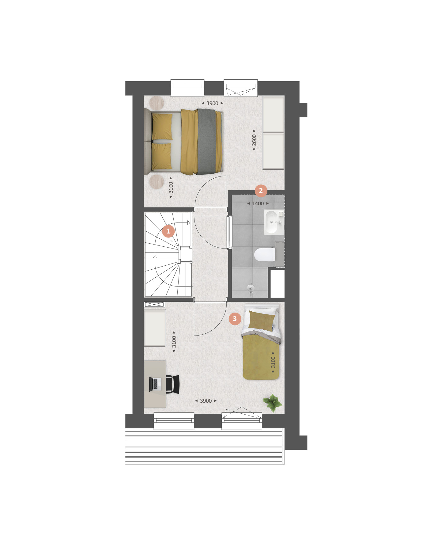 Op de verdieping vind je twee ruime slaapkamers, de badkamer met douche en wastafel en een techniekruimte met plek voor de wasmachine en droger.Ā Ā