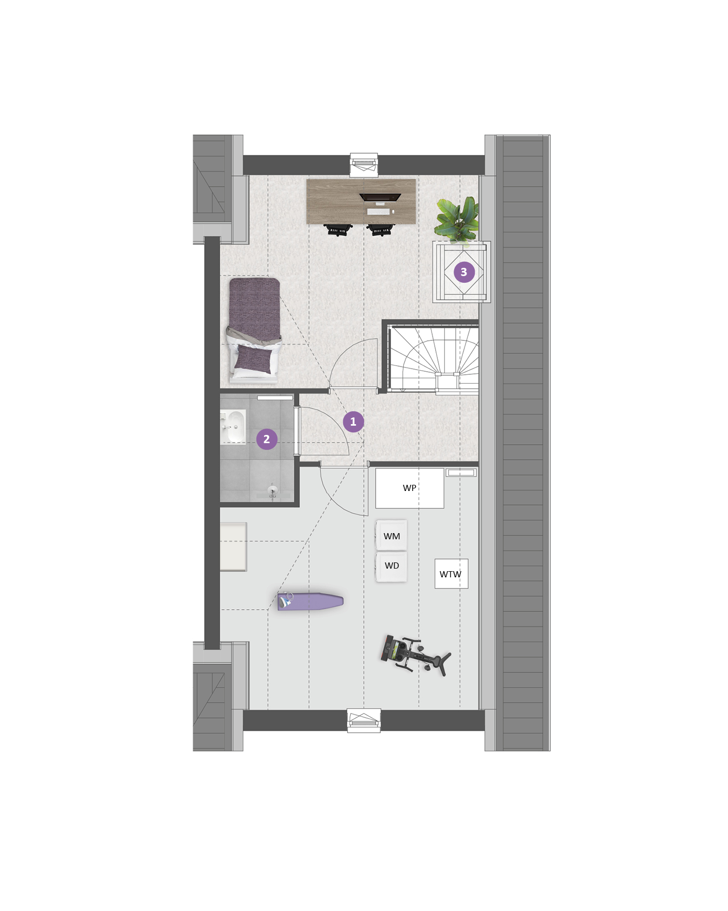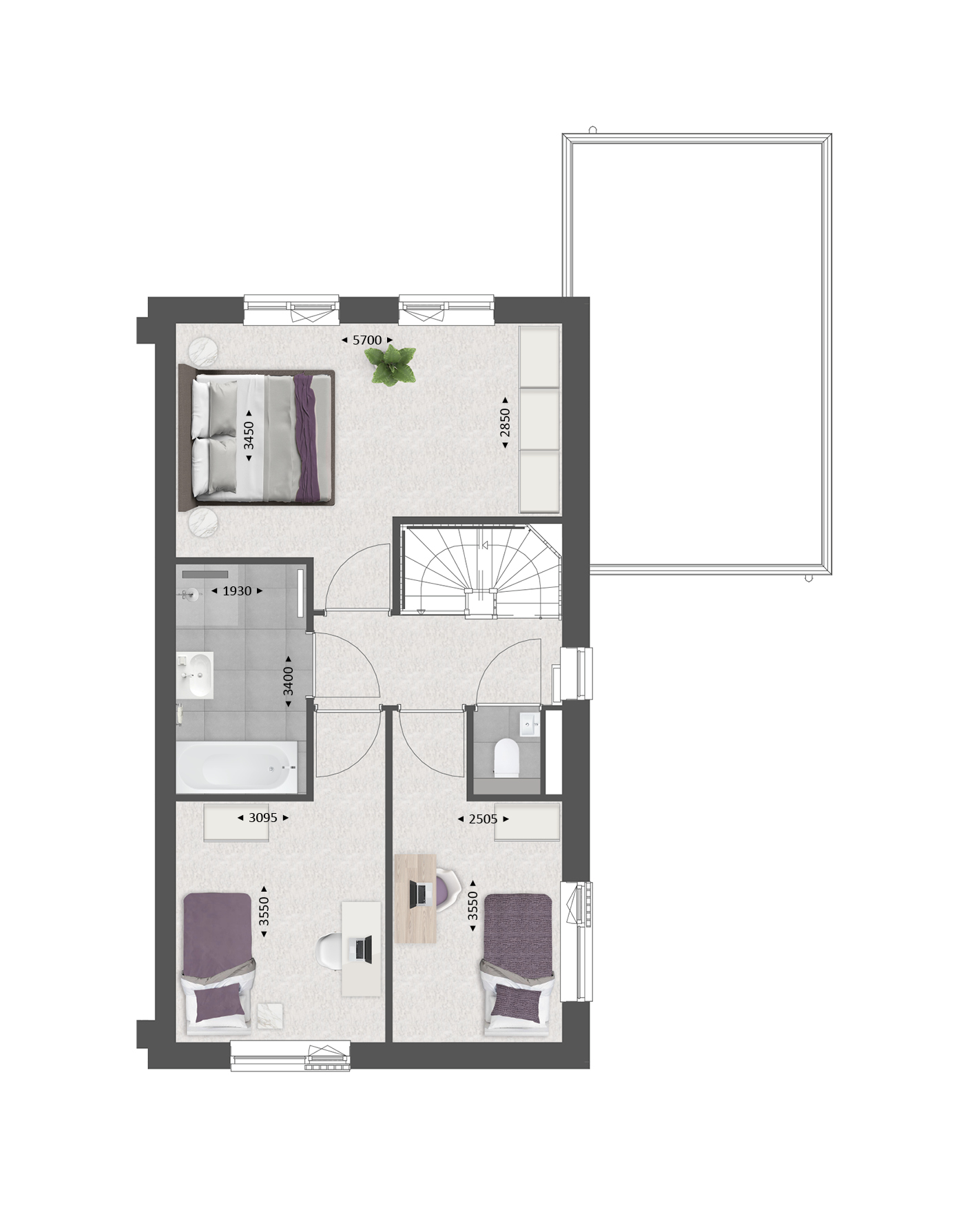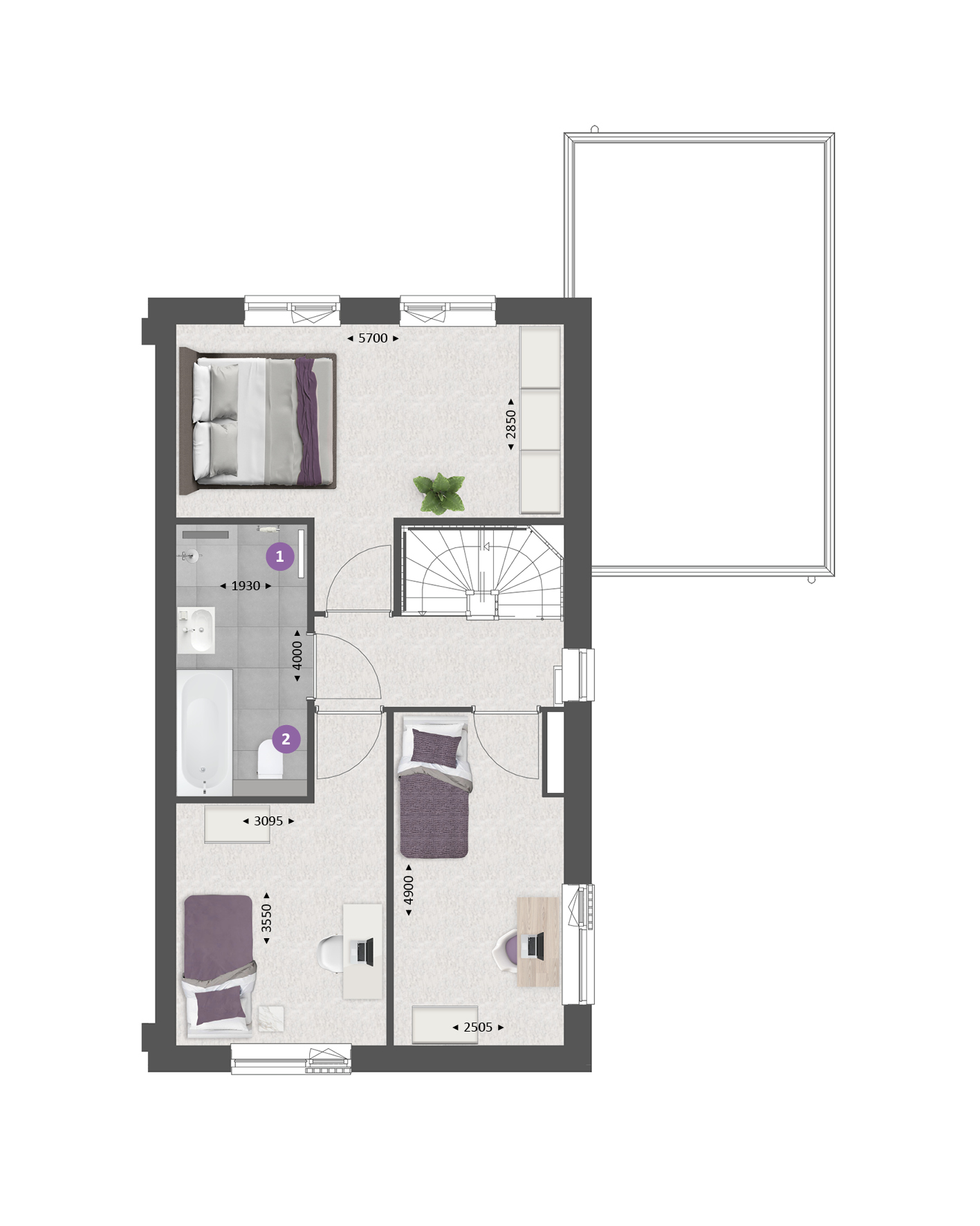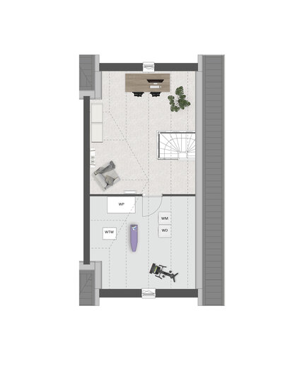 De tweede verdieping is ruim van opzet. Met een combinatie van diverse indelingsopties maak je hier een prachtige woonverdieping met bijvoorbeeld twee slaapkamers, een tweede badkamer en een was-/bergruimte.