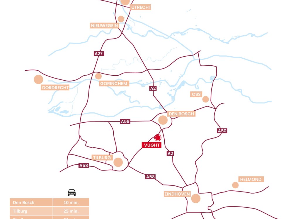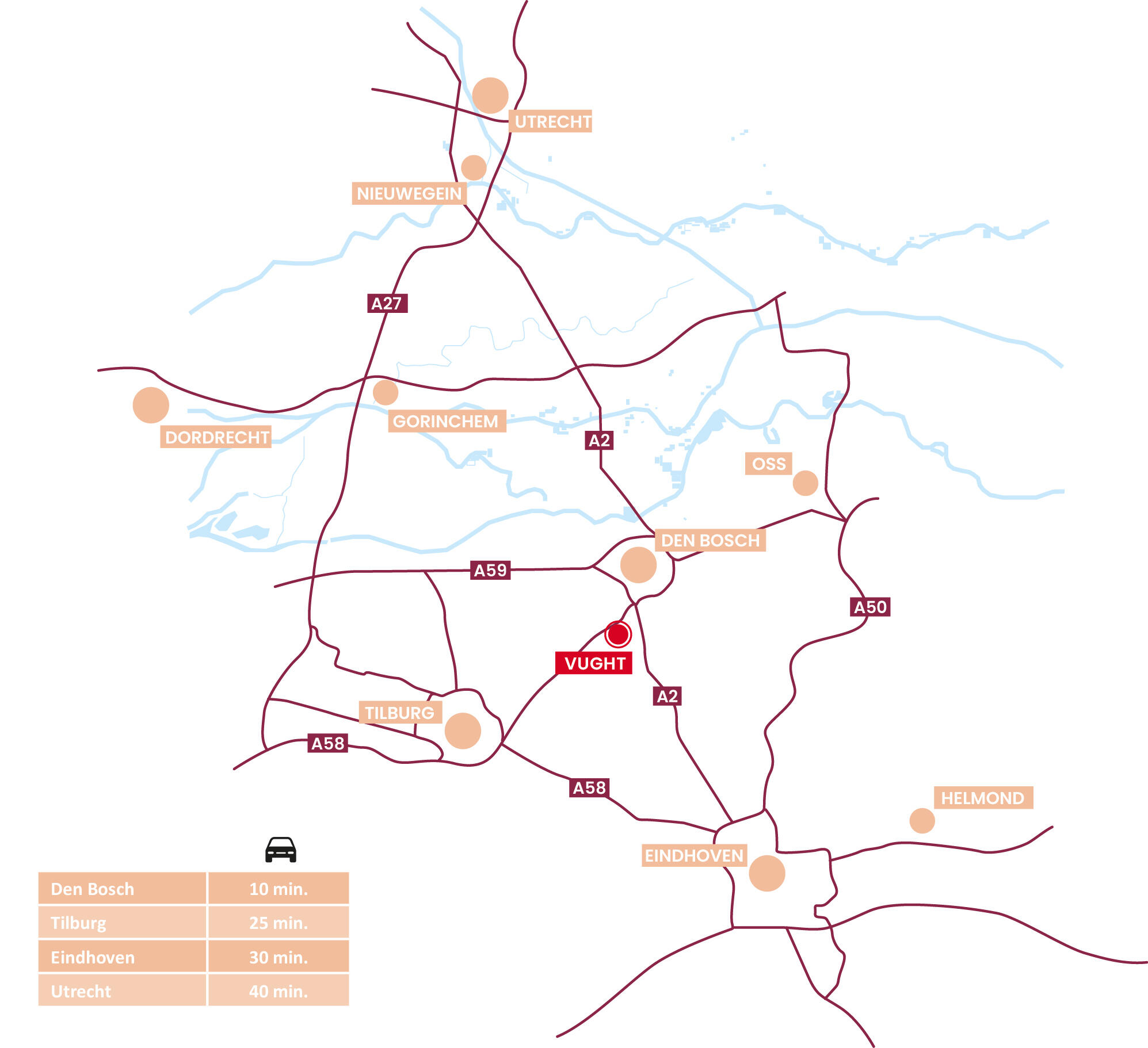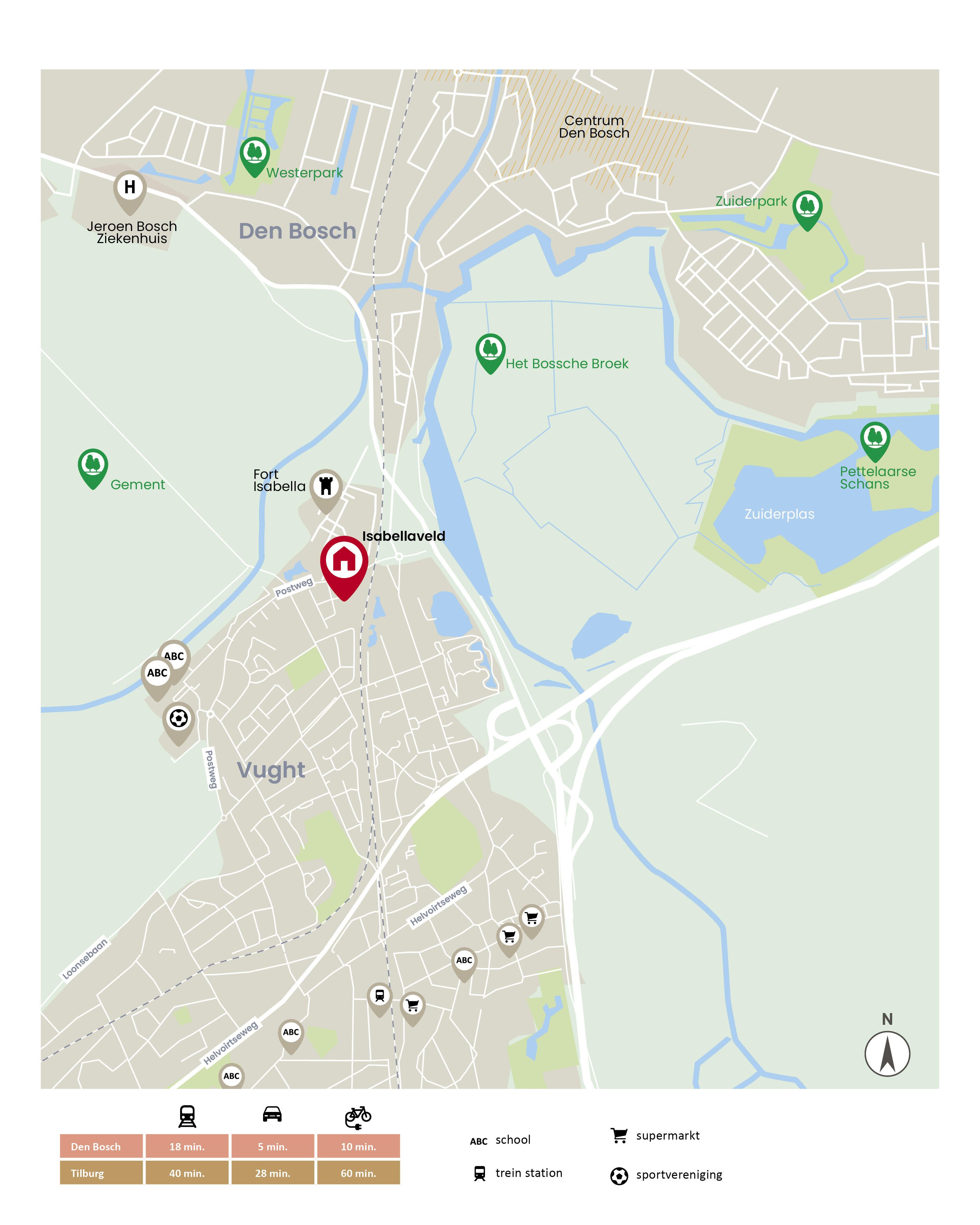 Isabellaveld biedt het beste van twee werelden: rust en natuur gecombineerd met uitstekende bereikbaarheid. Via de N65, A2 en A59 ben je zo in steden als ’s-Hertogenbosch, Eindhoven en Tilburg. Treinstation Vught ligt om de hoek, centraal station ’s-Hertogenbosch op slechts 15 minuten fietsen. Hiermee reis je gemakkelijk naar alle delen van Nederland.