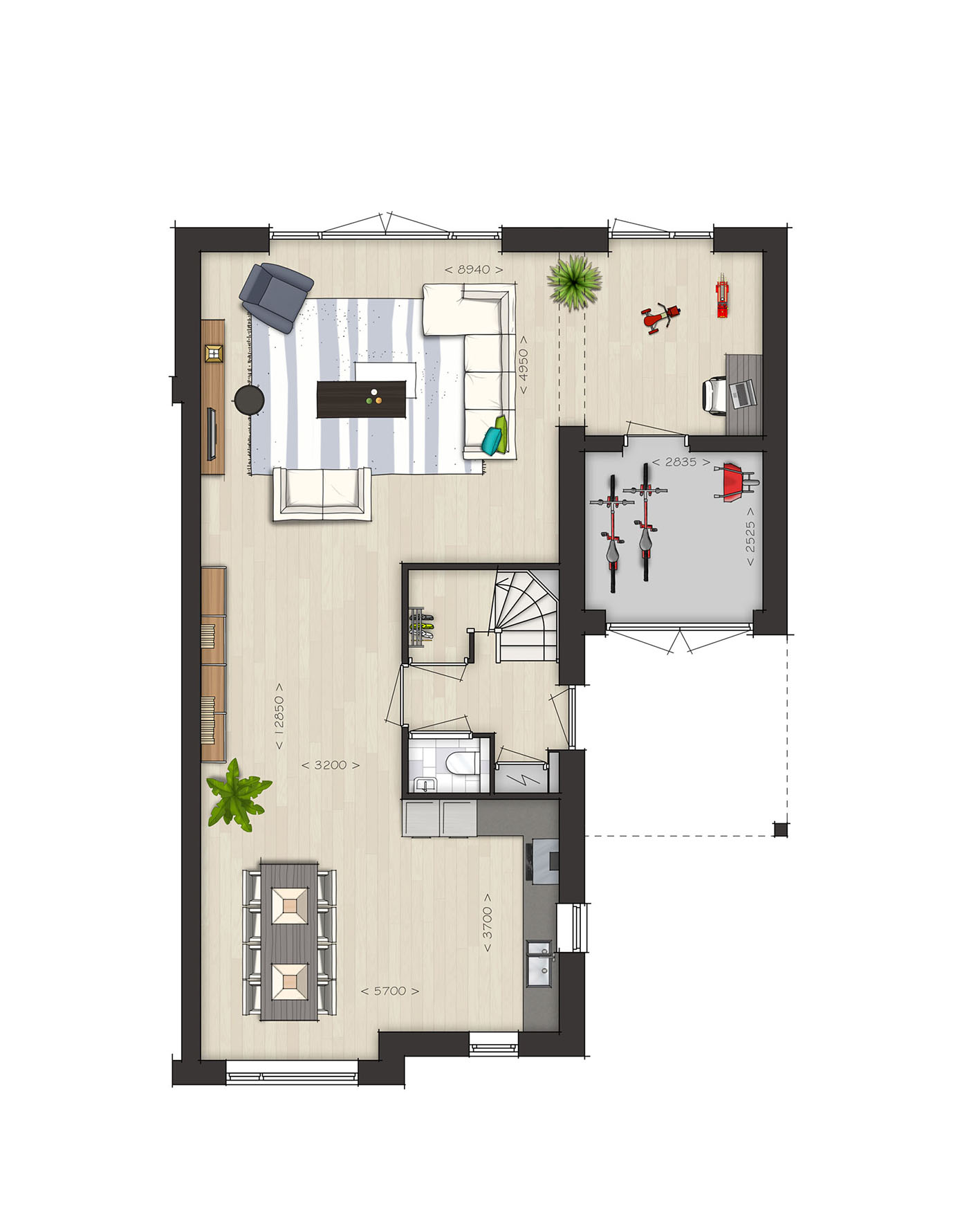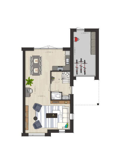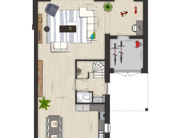 De indeling is bijzonder praktisch met beneden een hal met toilet en garderobe, een lichte L-vormige woonkamer, een open keuken met ruime eethoek. De begane grond kan vergroot worden met een uitbouw van 1.20 of 2.40 meter, waarbij de keuken eventueel naar de voorzijde verplaatst kan worden. Met de optie om de garage te verlengen en/of te splitsen in een berging en een ruimte bij de woning te betrekken, creƫer je extra veel leefruimte op de begane grond.