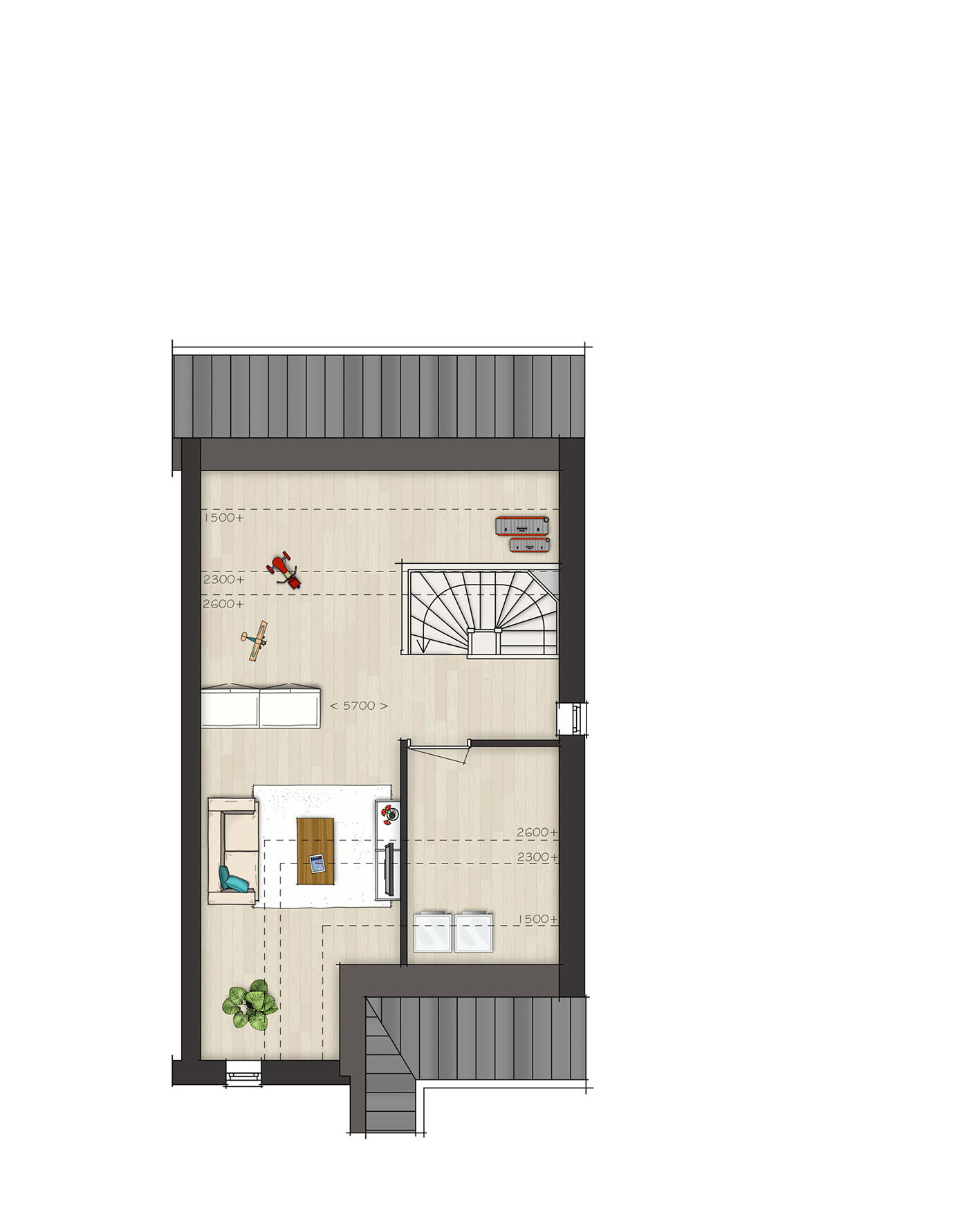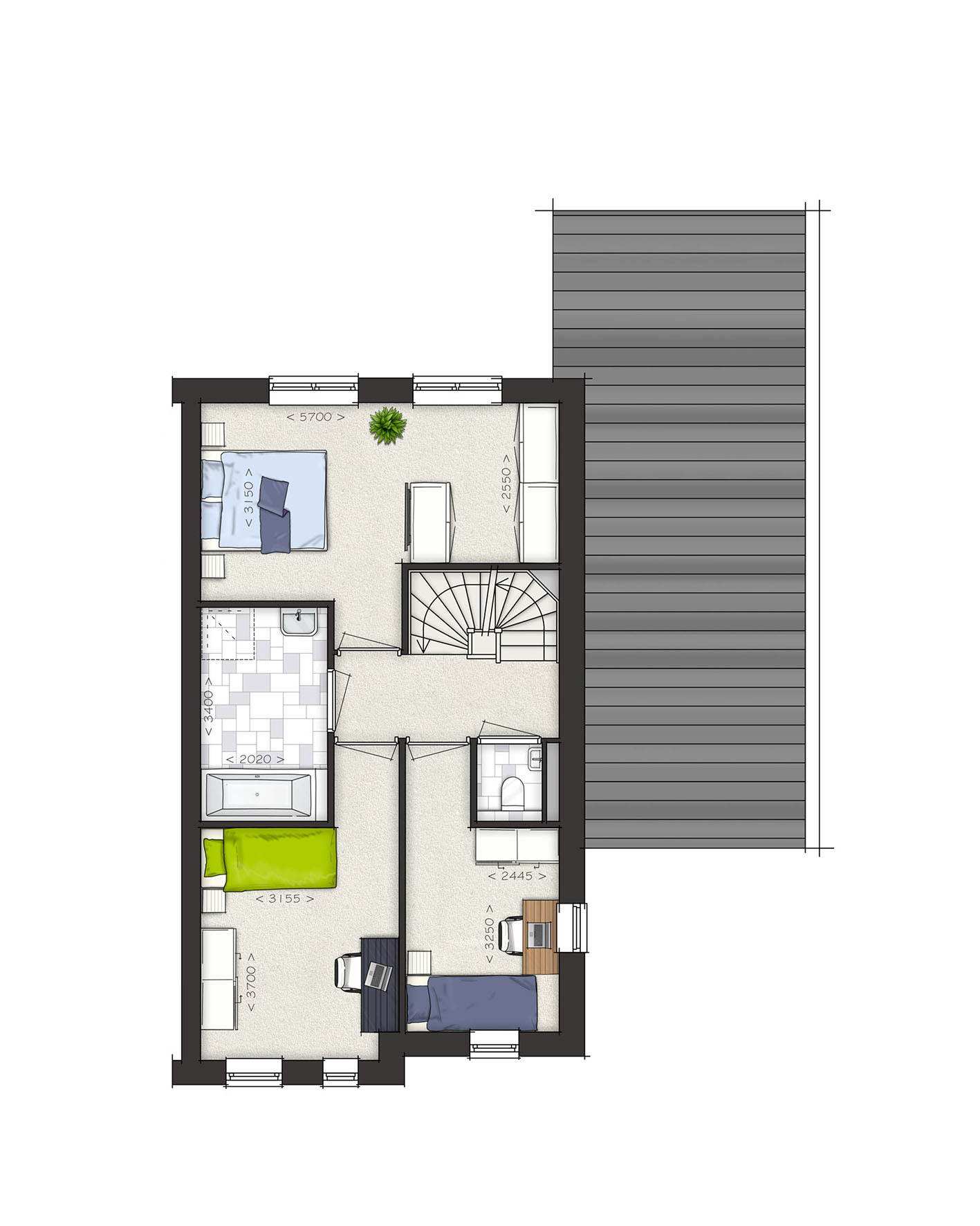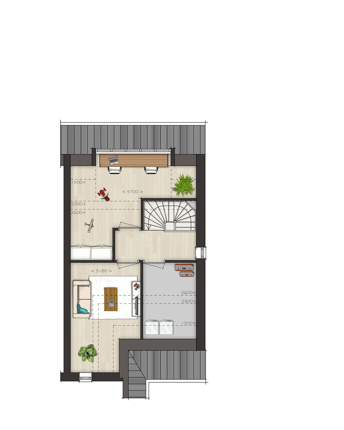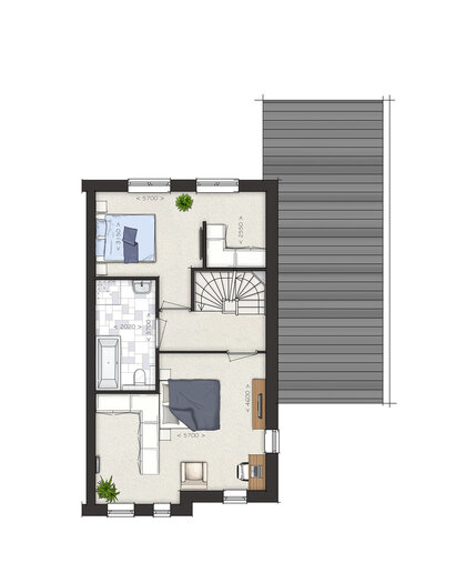 De tweede verdieping is ruim van opzet. Met een combinatie van diverse indelingsopties maak je hier een prachtige woonverdieping met bijvoorbeeld twee slaapkamers, een tweede badkamer en een was-/bergruimte. Zie jij jezelf hier al wonen?