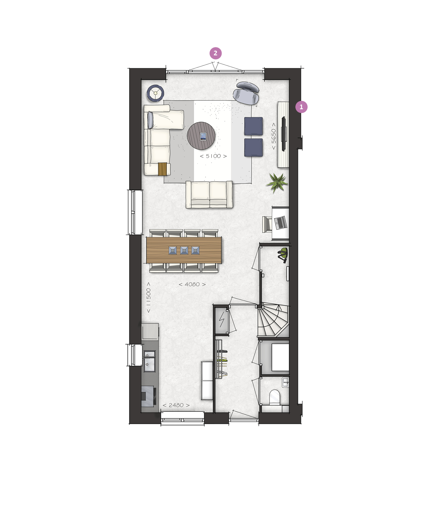 De indeling is bijzonder praktisch met beneden een hal met toilet en technische ruimte, een lichte tuingerichte woonkamer en een open keuken met zicht op de straat. De woonkamer wordt door de standaard uitbouw van 2.40 meter nóg groter. De optie voor openslaande tuindeuren zorgen voor veel contact met de achtertuin.Ā