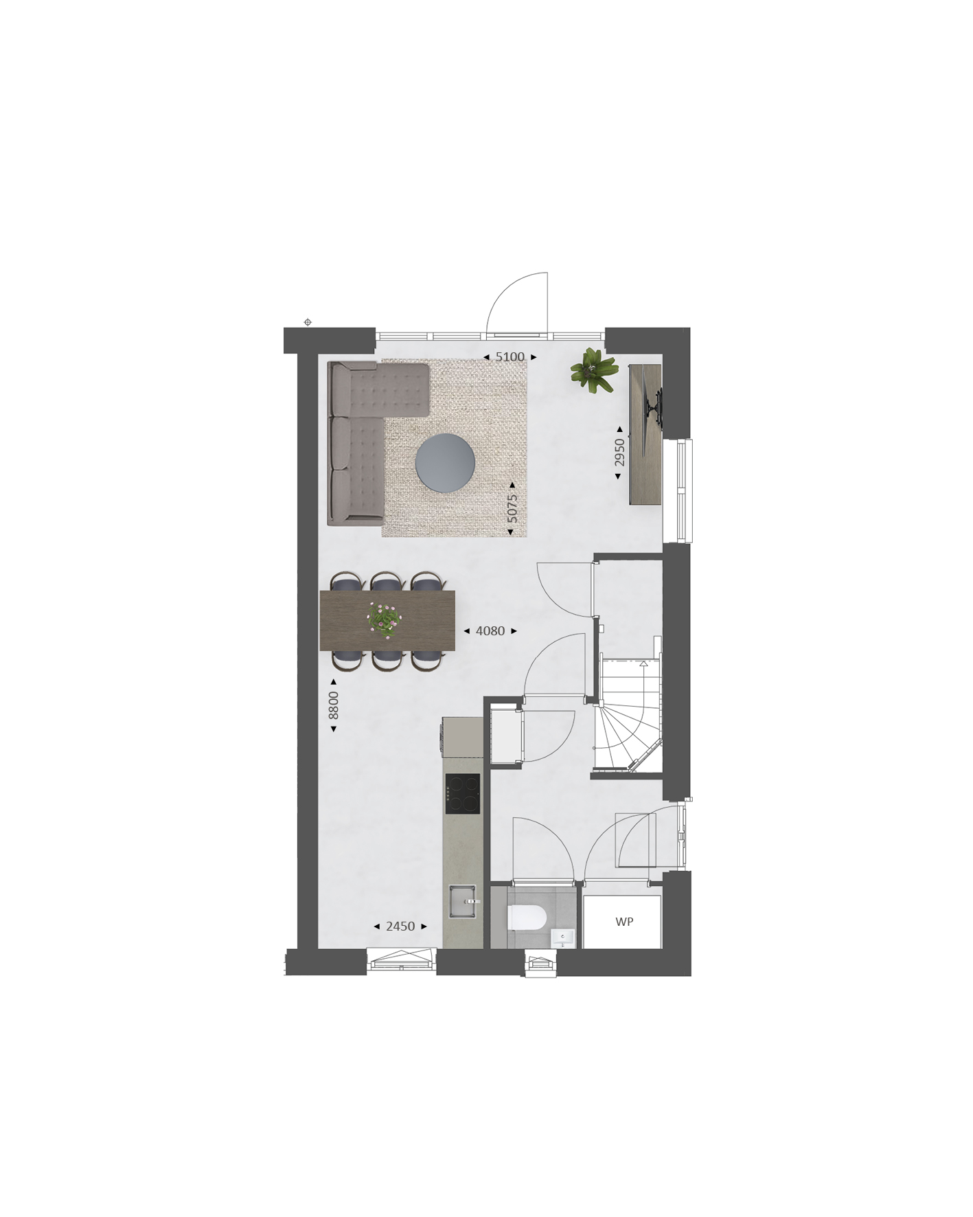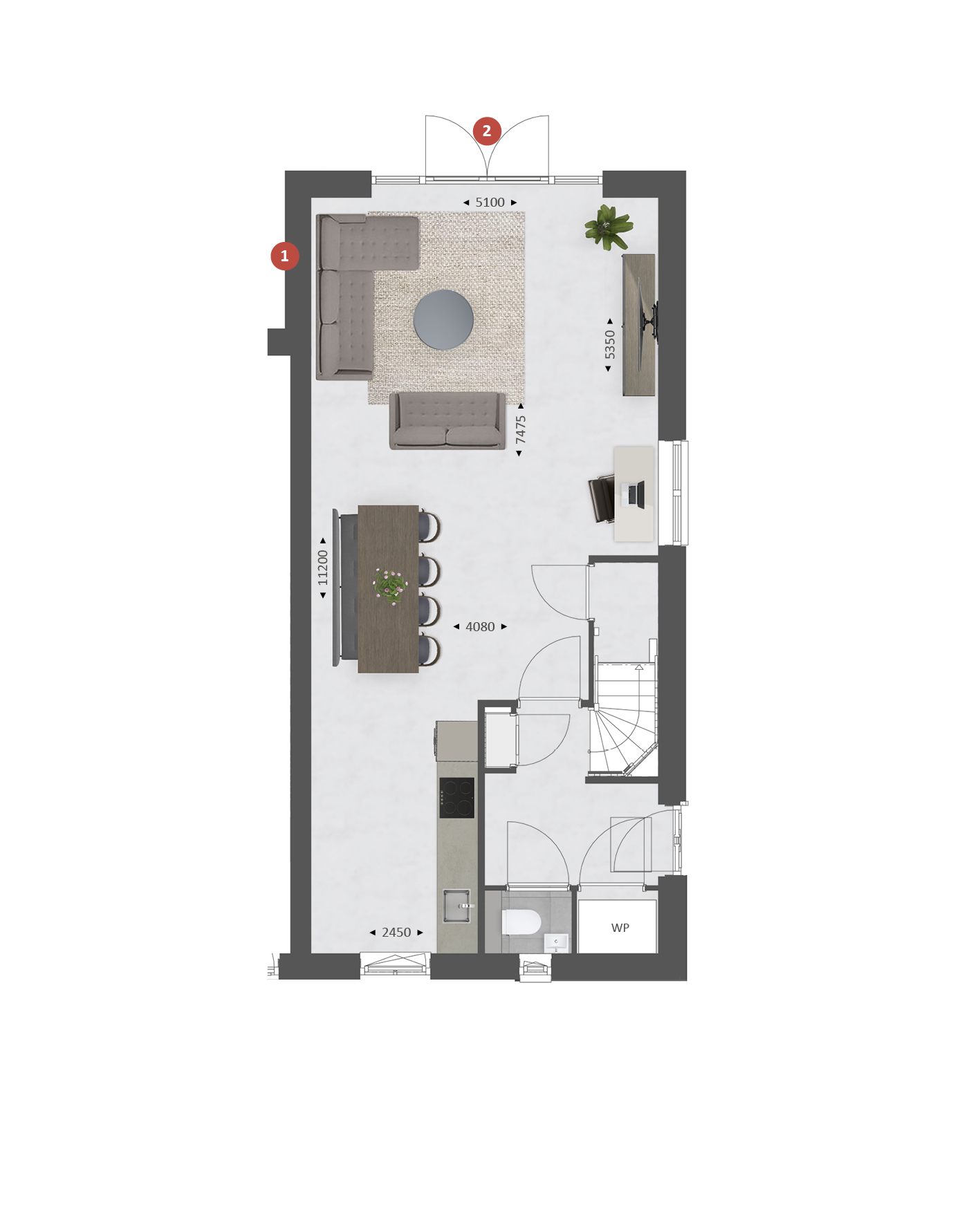 De indeling is bijzonder praktisch met beneden een hal met toilet en technische ruimte, een lichte tuingerichte woonkamer en een open keuken met zicht op de straat. TIP: Maak de woonkamer nóg groter met de optie om deze met 1.20m of 2.40m uit te breiden. De optie voor openslaande tuindeuren zorgen voor veel contact met de achtertuin.Ā Ā