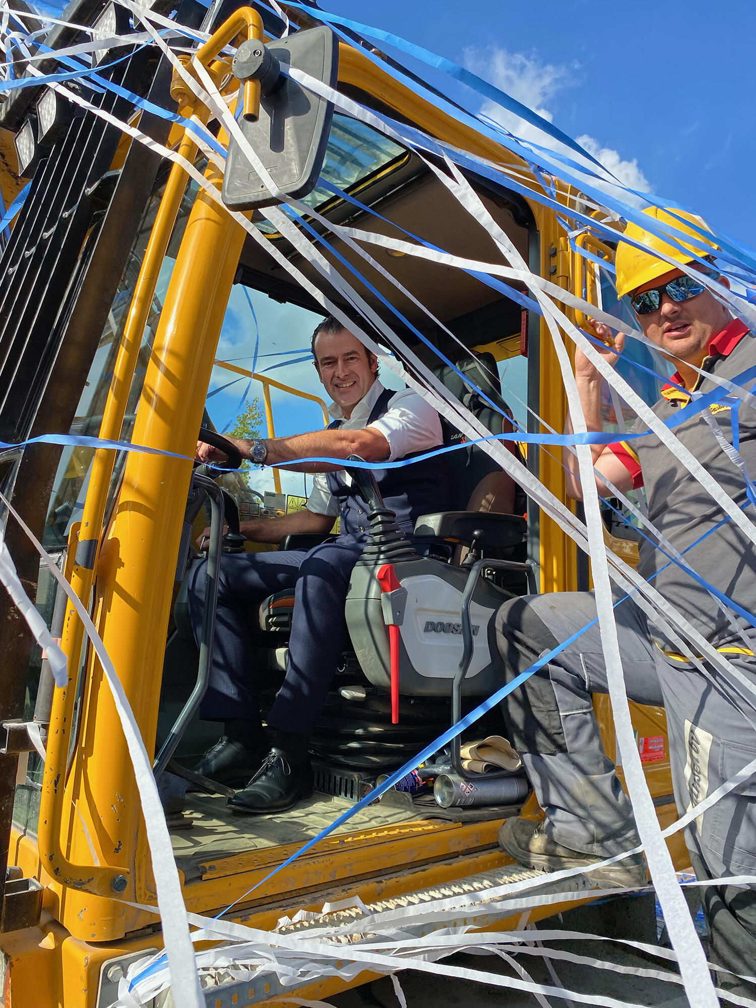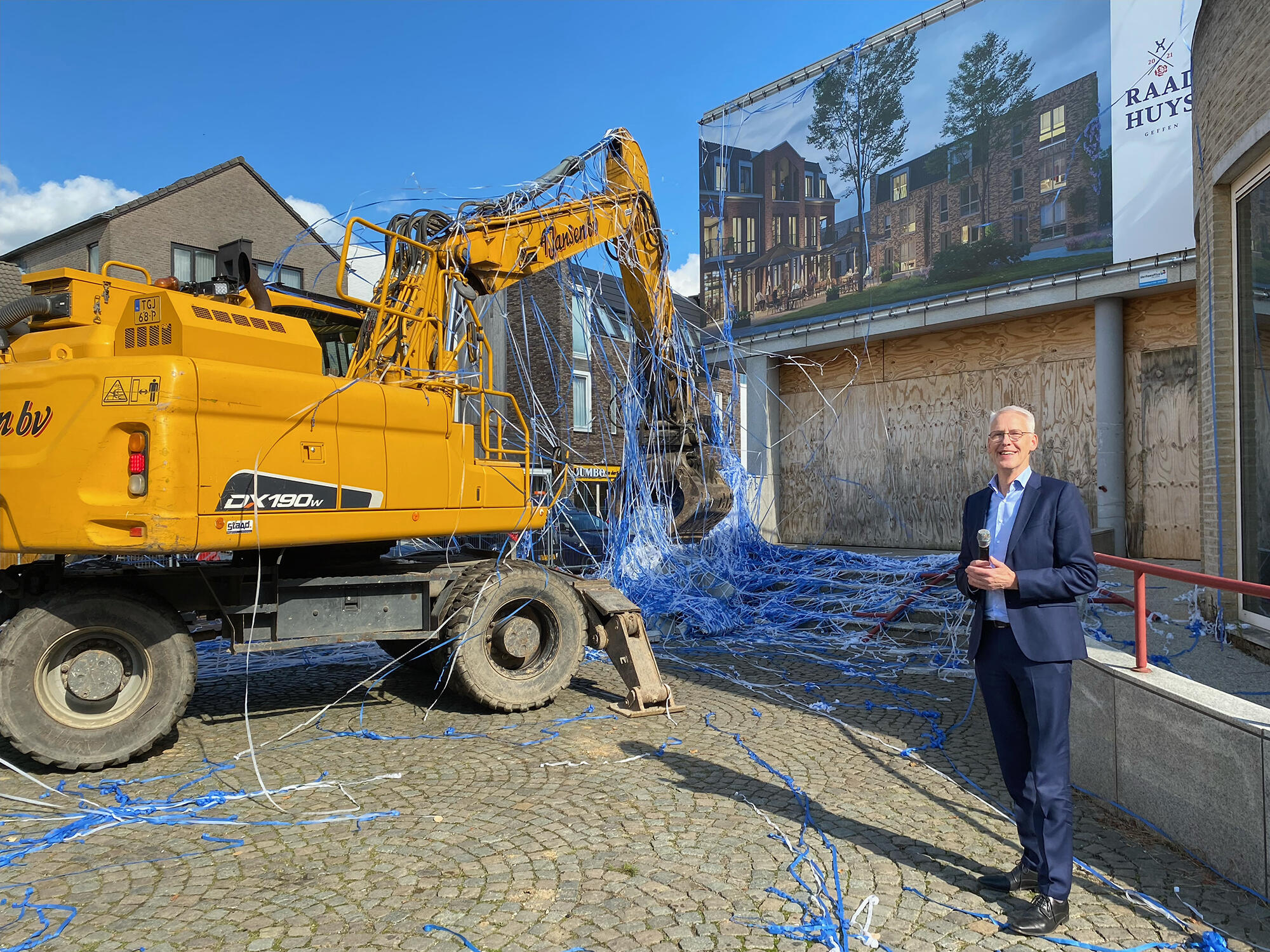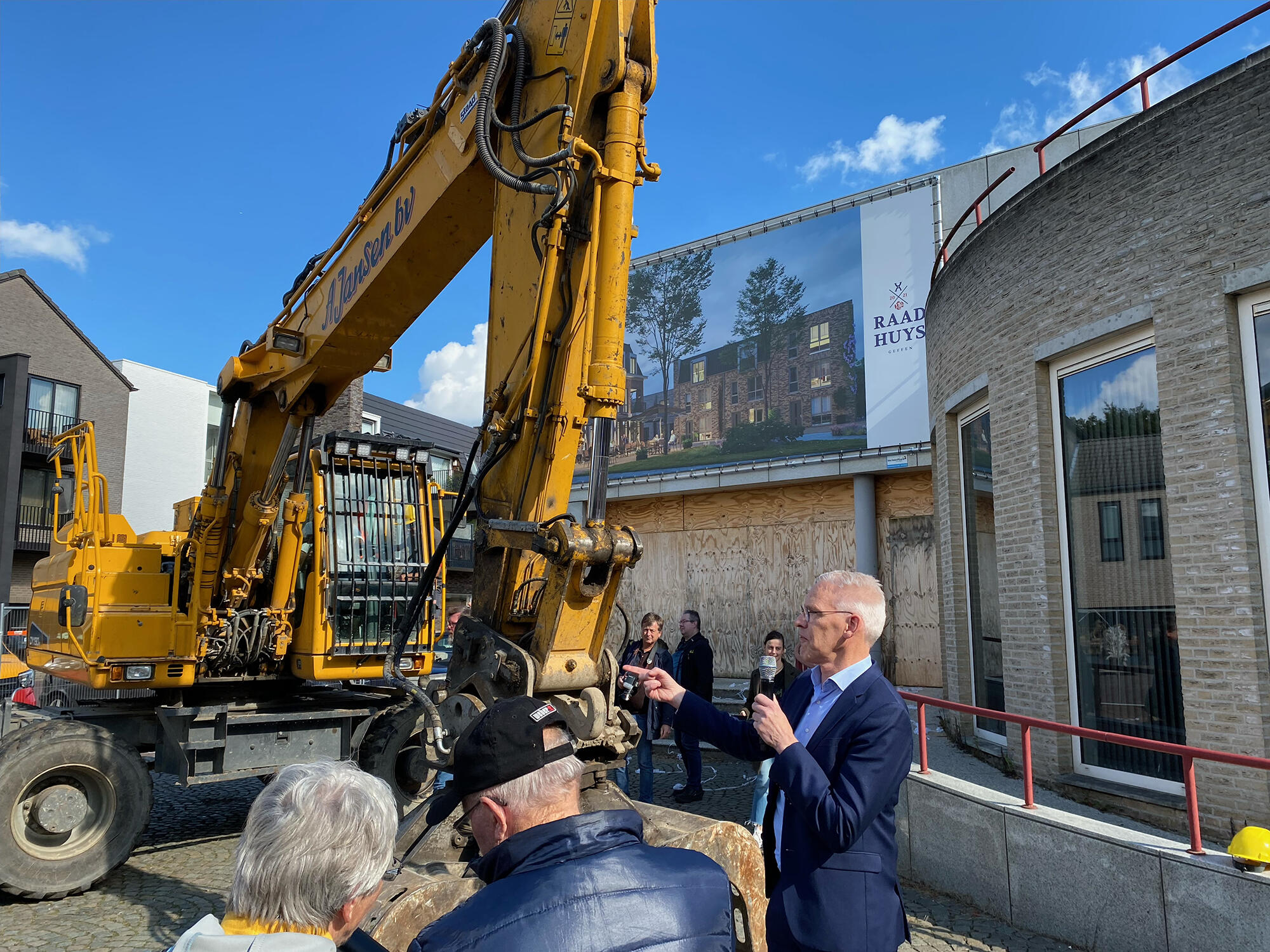 De start van de sloopwerkzaamheden van het oude gemeentehuis in Geffen is vandaag op feestelijke wijze ingeluid. Met wethouder Sidney van den Bergh op de sloopmachine zijn de werkzaamheden officieel gestart. Dit mooie moment werd gevierd met onder andere de betrokken wethouder en projectleider van de Gemeente Oss, leden van de dorpsraad, omwonenden, toekomstige bewoners en directie en betrokken projectontwikkelaar van Van Wanrooij.