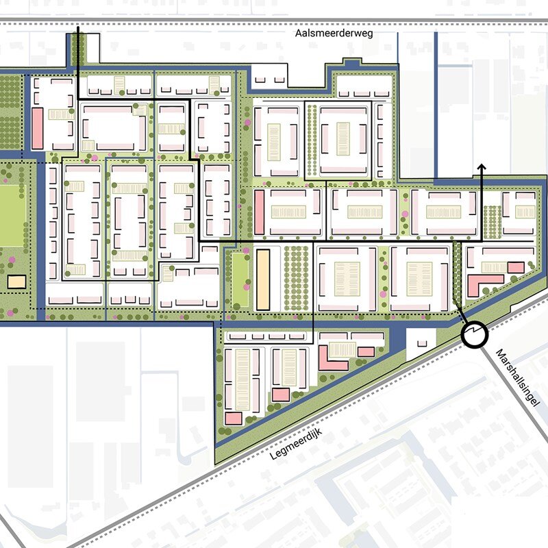 Impressie van de gebiedsontwikkeling Oosteindedriehoek in Aalsmeer: een grote transformatieopgave naar woningbouwontwikkeling, waar in verschillende deelprojecten zo’n 2.300 woningen gerealiseerd worden. Van Wanrooij is samen met twee andere partijen betrokken bij het eerste deelproject.