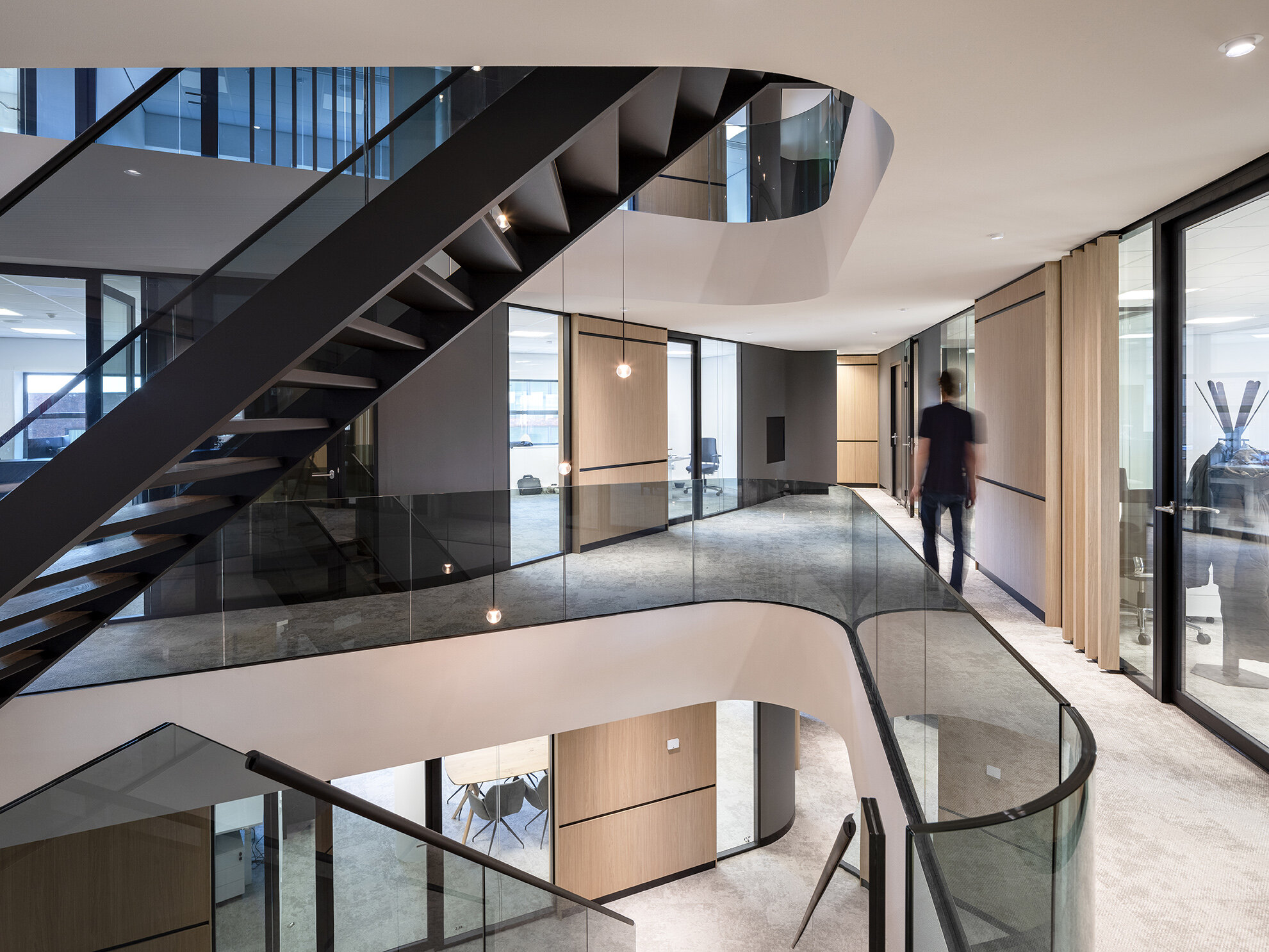 Voor Rodi van der Horst, interieurarchitect en partner bij INBO, was de opgave om collega’s meer met elkaar in contact te brengen. “In Geffen zat iedereen in een eigen kamer in lange gangen. De structuur met kamers wilde Van Wanrooij graag behouden, maar het spontane contact moest gestimuleerd en anders georganiseerd worden. De grote vide, de open trappen en de transparante wanden in ons ontwerp waren een belangrijke basis om aan deze wens te voldoen. Bouwkundig gezien waren de plattegronden van dit bestaande kantoor best dwingend en ooit bedacht voor ‘open vloeren’. We wilden de diepte in het gebouw meer laten ervaren en het gebouw ruimtelijk interessant maken, maar dat is best een uitdaging als er ook een kamerstructuur wordt gevraagd.